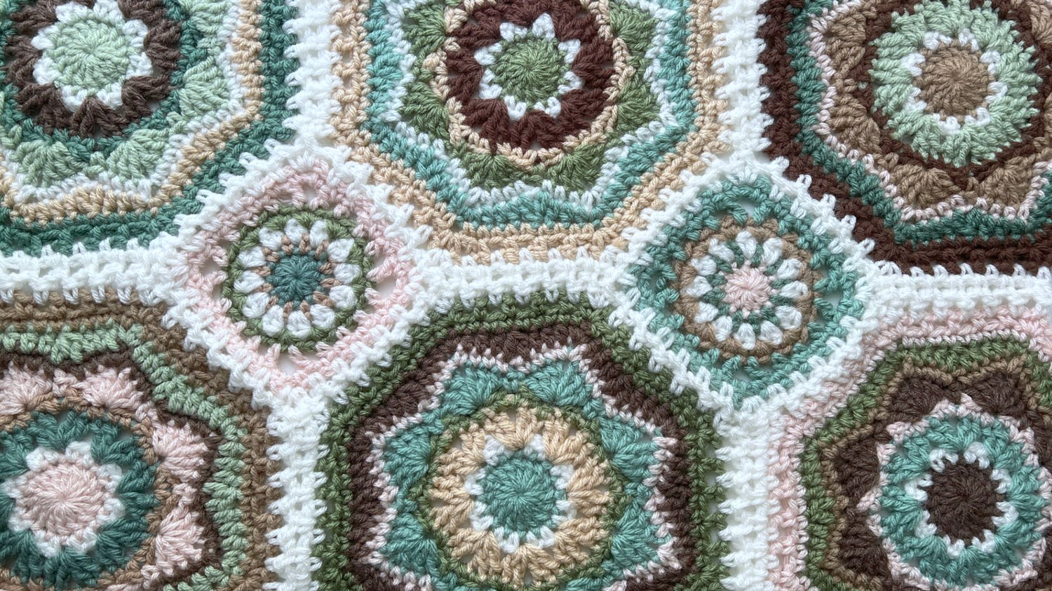 The Mandala Breeze Blanket is a stunning full-size crochet design that brings together two of my favourite motifs—the Mandala Square, in it's octagon form, and the Breezy Blossom Square. These shapes come together beautifully, blending structure and flow for a decorative, artful look. The colour palette is soft yet grounded, combining gentle pinks and greens with earthy browns for a balanced, nature-inspired feel. Whether draped across a bed or displayed as a statement throw, the Mandala Breeze Blanket adds warmth, elegance, and a touch of handcrafted artistry to any space.