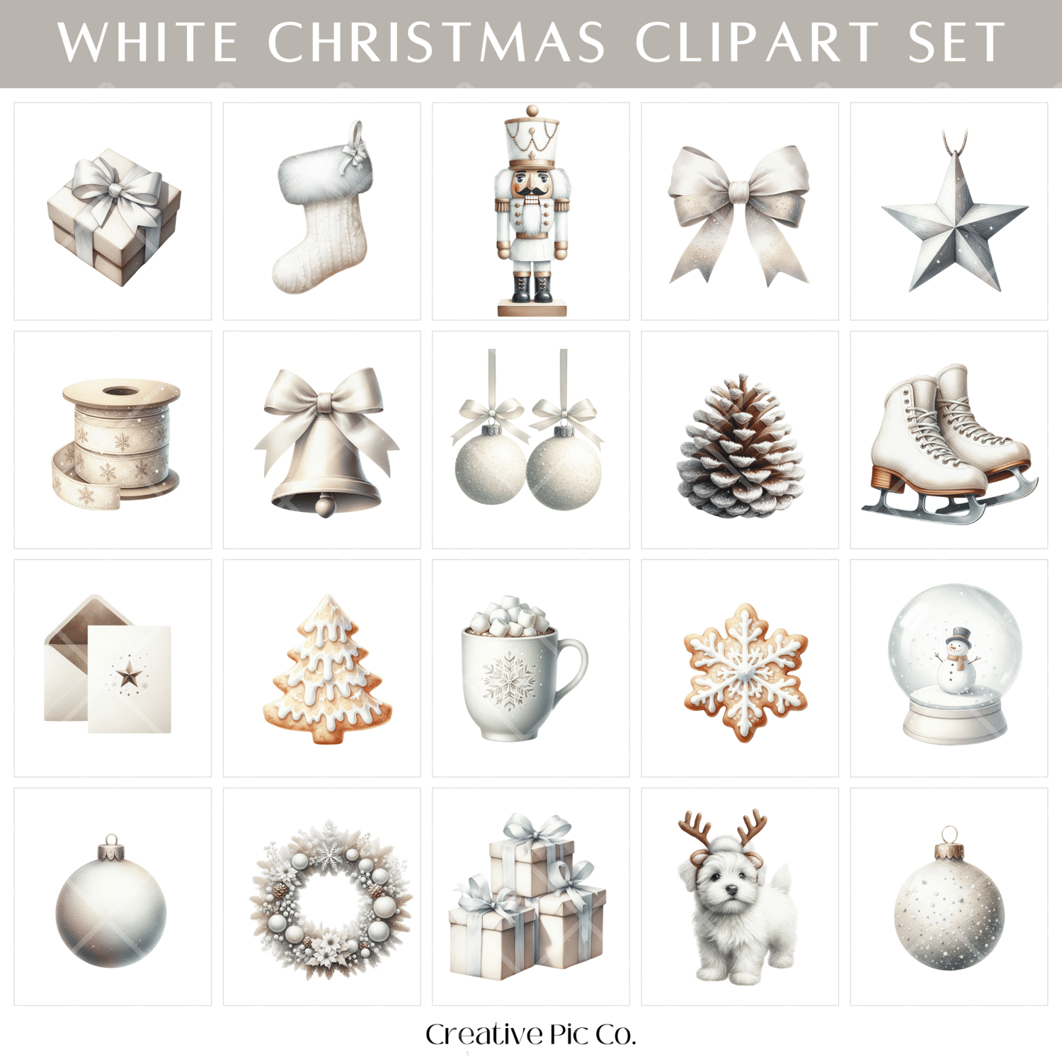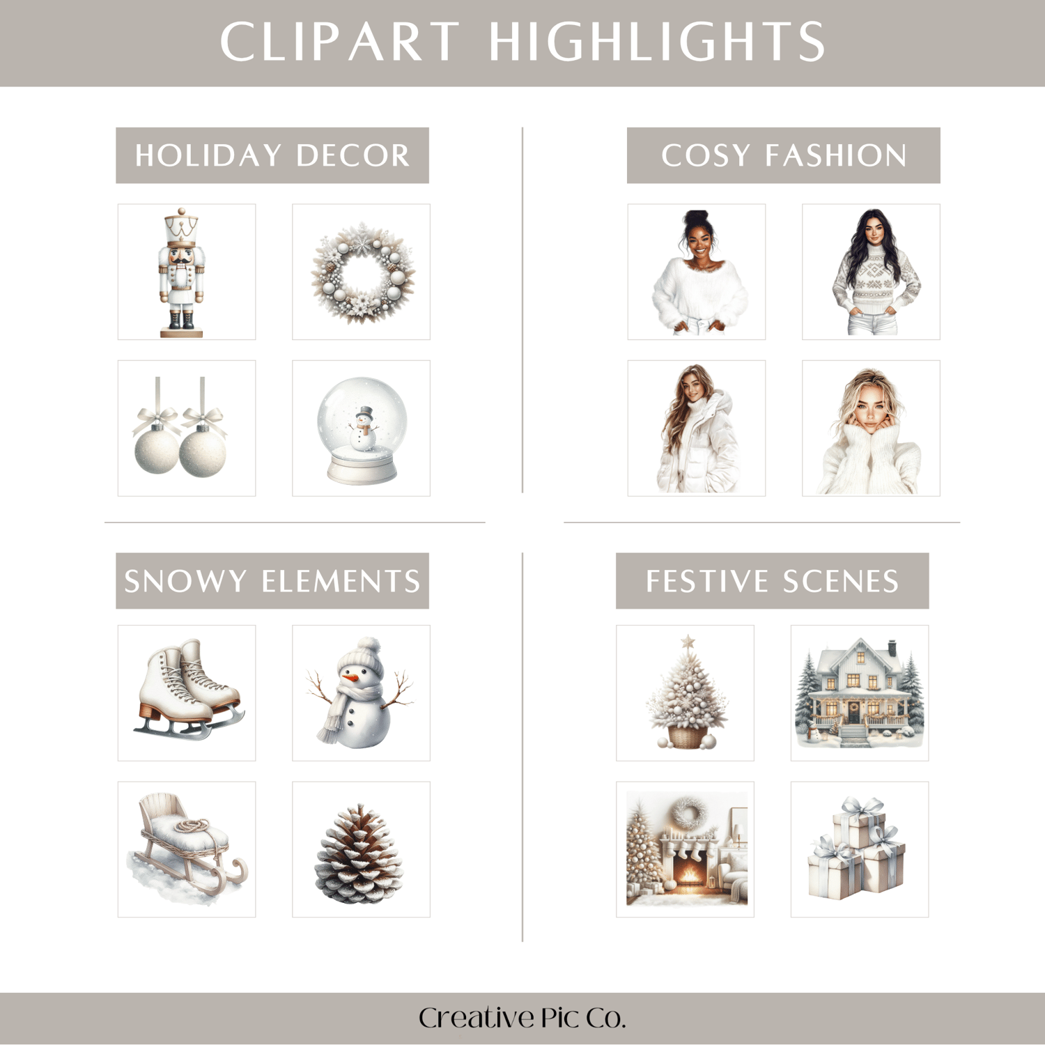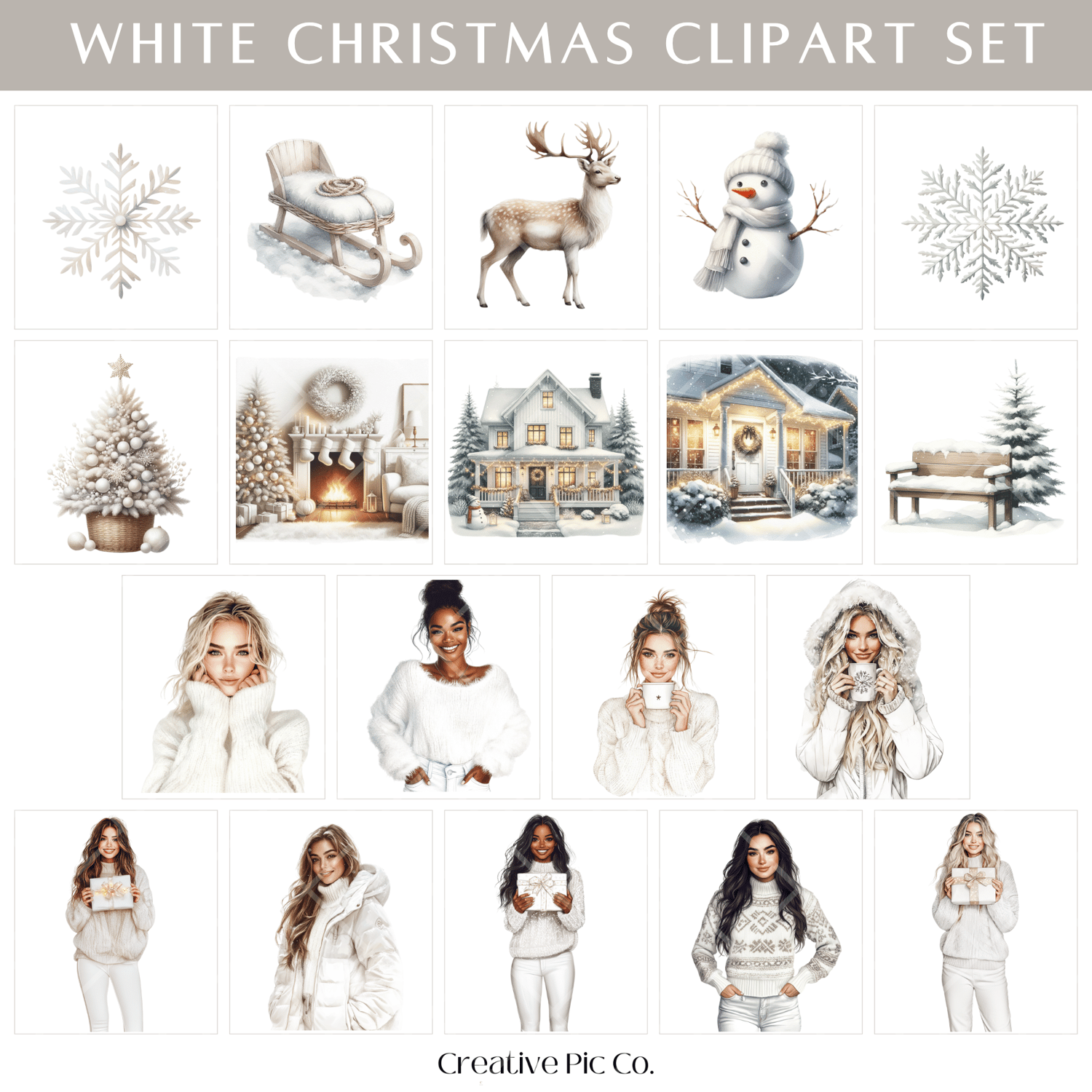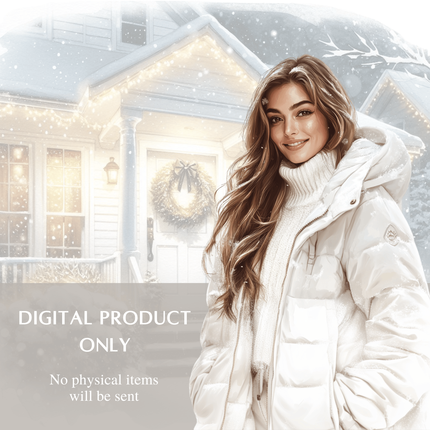 Bring a soft and sophisticated glow to the season with the White Christmas Clipart Set. This elegant holiday collection includes 39 PNGs in a dreamy neutral palette featuring snow-covered homes, cosy fashion looks, ornaments, wrapped gifts, festive trees, and delicate winter décor. With a gentle watercolour finish, it’s the perfect set for creating modern, classy Christmas content with a serene, wintry touch.
