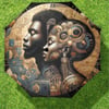 This stunning artwork showcases two African figures in profile, symbolizing unity and balance. The man and woman are intricately adorned with geometric and mechanical patterns in gold and bronze tones, blending elements of African heritage with futuristic motifs. The woman’s head is decorated with elaborate circular designs, while the man's strong, natural features complement the intricate detailing. The harmonious blend of tradition and innovation creates a timeless narrative.