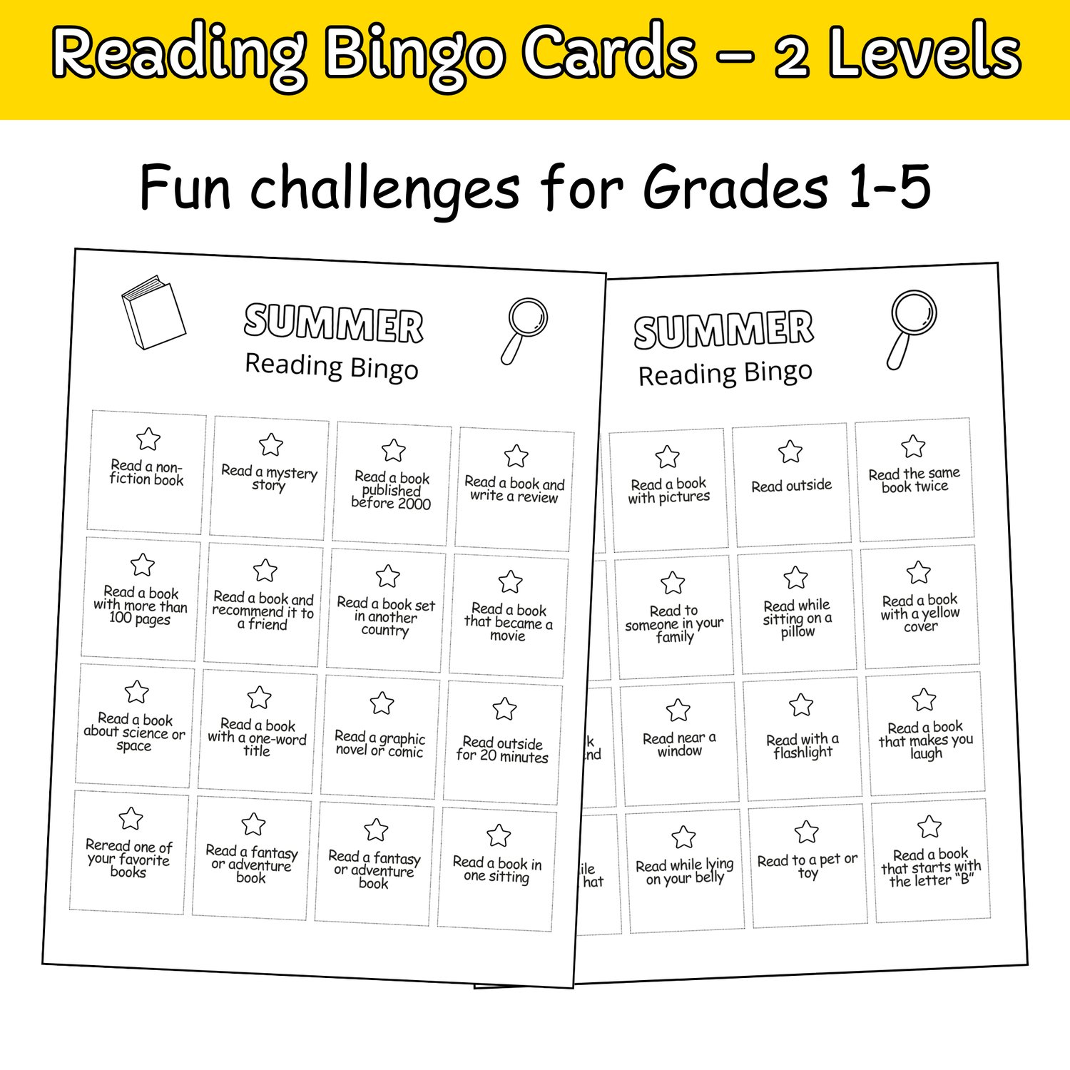 - Grades 3–5: 16 engaging prompts (e.g., "Read a mystery book," "Read a book published before 2000").