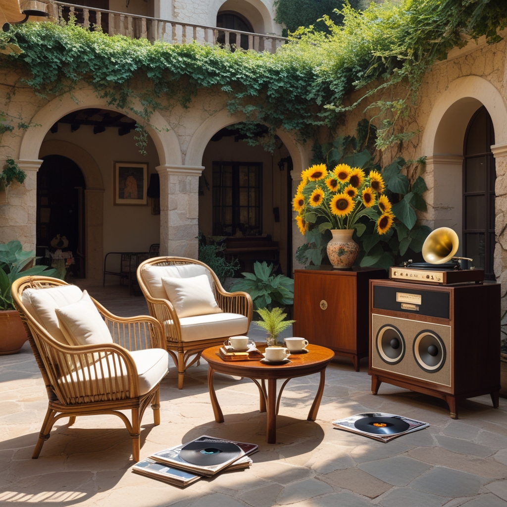 Bathed in soft daylight and surrounded by rustic stone architecture, this enchanting Mediterranean courtyard transforms into a serene outdoor jazz sanctuary. Ivy cascades gently from the upper balcony, framing arched doorways that lead to cozy rooms beyond, while terracotta pots brim with lush greenery and vibrant tropical leaves.