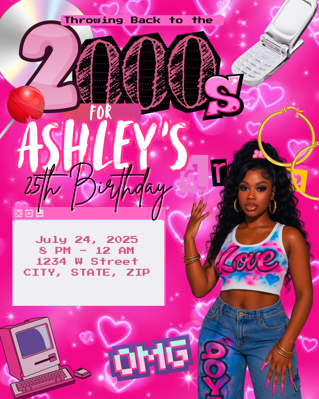 Turn heads and set the tone with this glammed-out, Y2K-inspired birthday flyer template! Perfect for parties, girls’ nights, or throwback baddie events, this design gives full 2000s fantasy – think rhinestones, baby phat vibes, flip phones, and bling everything 💅🏽✨