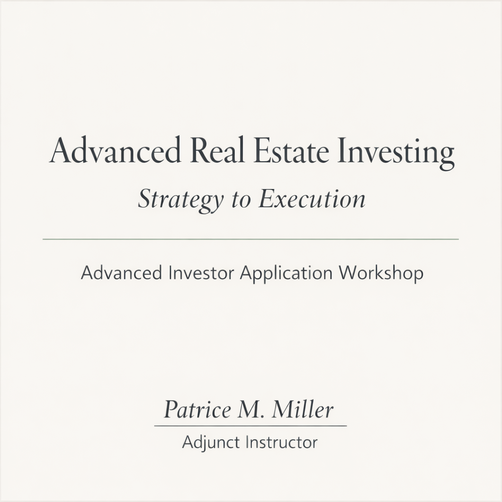 This 6-week advanced virtual workshop is designed for students who are ready to move beyond learning and begin applying real estate investing strategies through guided discussion, deal analysis, and real-world decision-making.