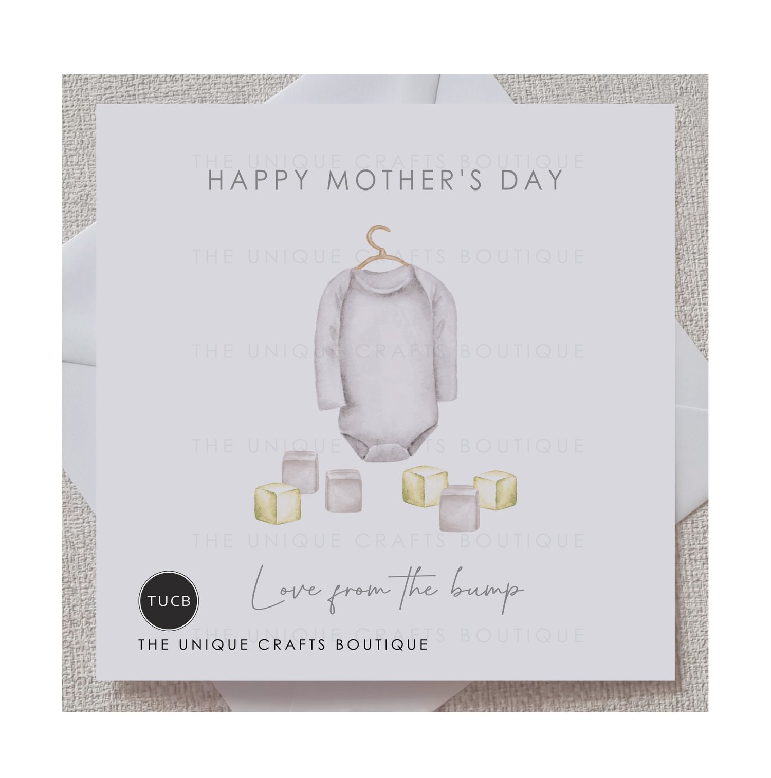 This card is perfect for a new pregnancy. Printed with a sweet baby vest and a neutral yellow set of building blocks with a message which reads 'Happy Mother's Day, love from the bump'.