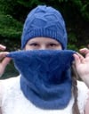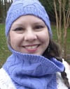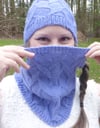 Photos show cowl and matching hat knit in Cascade 220 Superwash in color 844 (periwinkle) and color 885 (In the Navy).