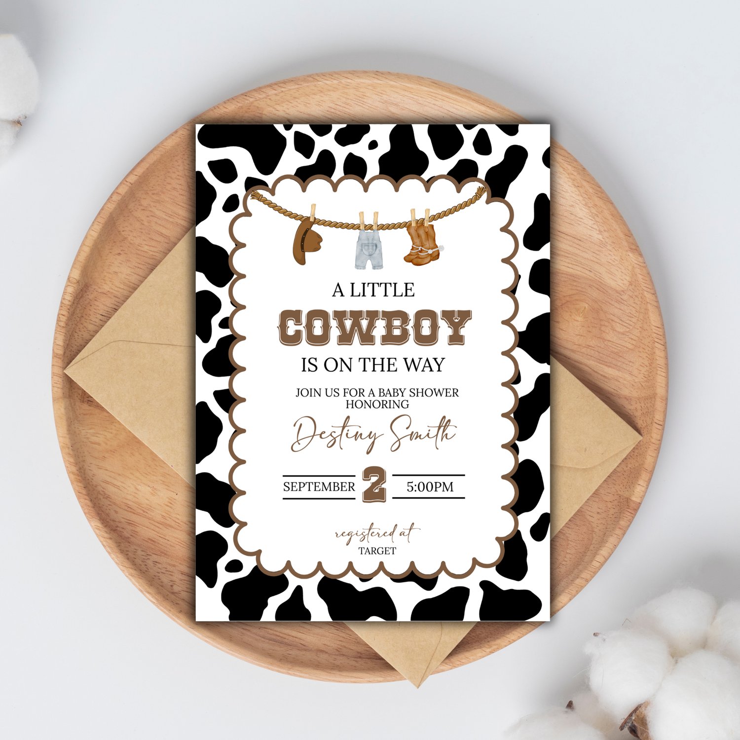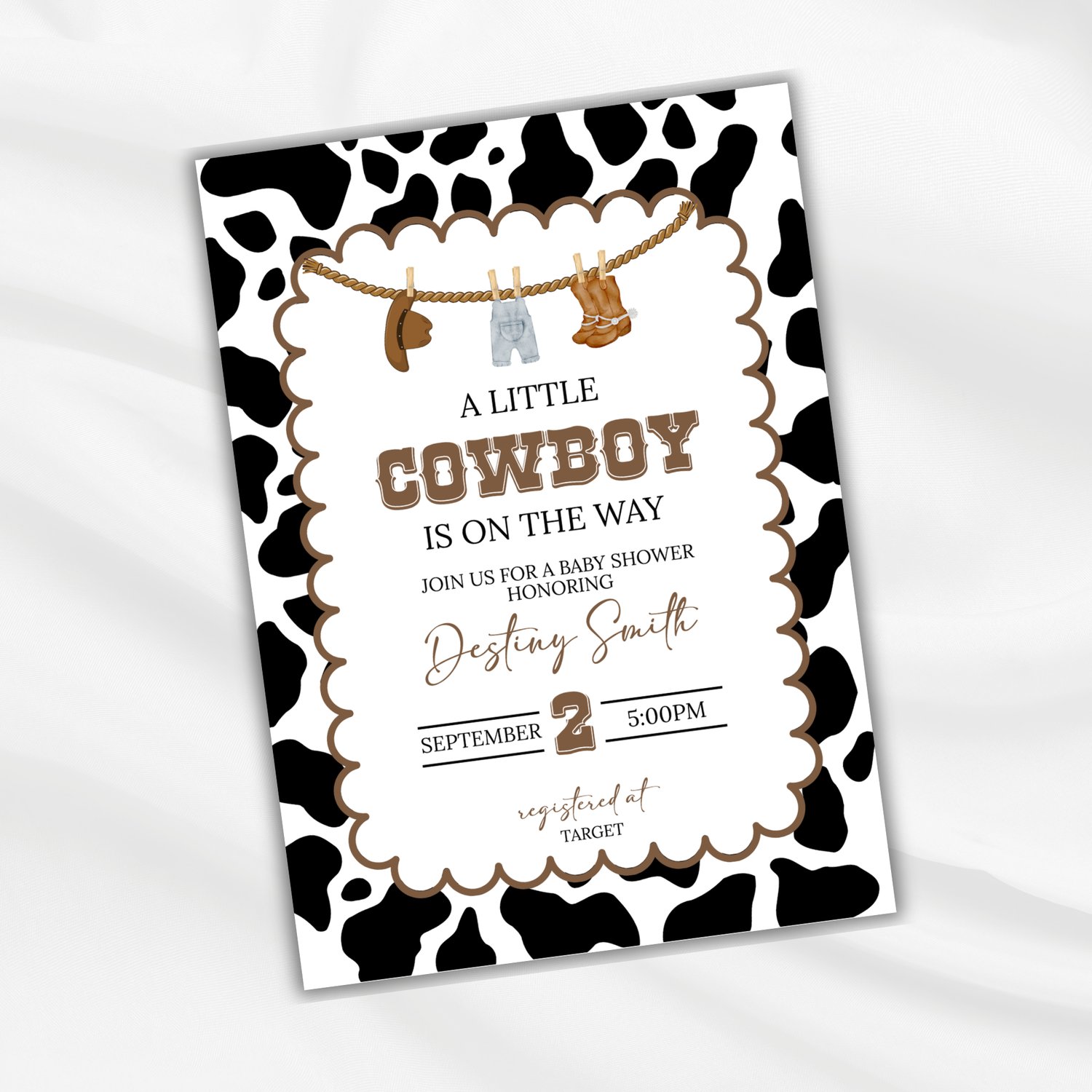 Celebrate your little cowboy on the way with thisĀ editable western-themed baby shower invitation! Featuring a rustic rope border, cow print background, and adorable western baby clothes hanging on a line, this invitation sets the perfect tone for a country-style celebration.