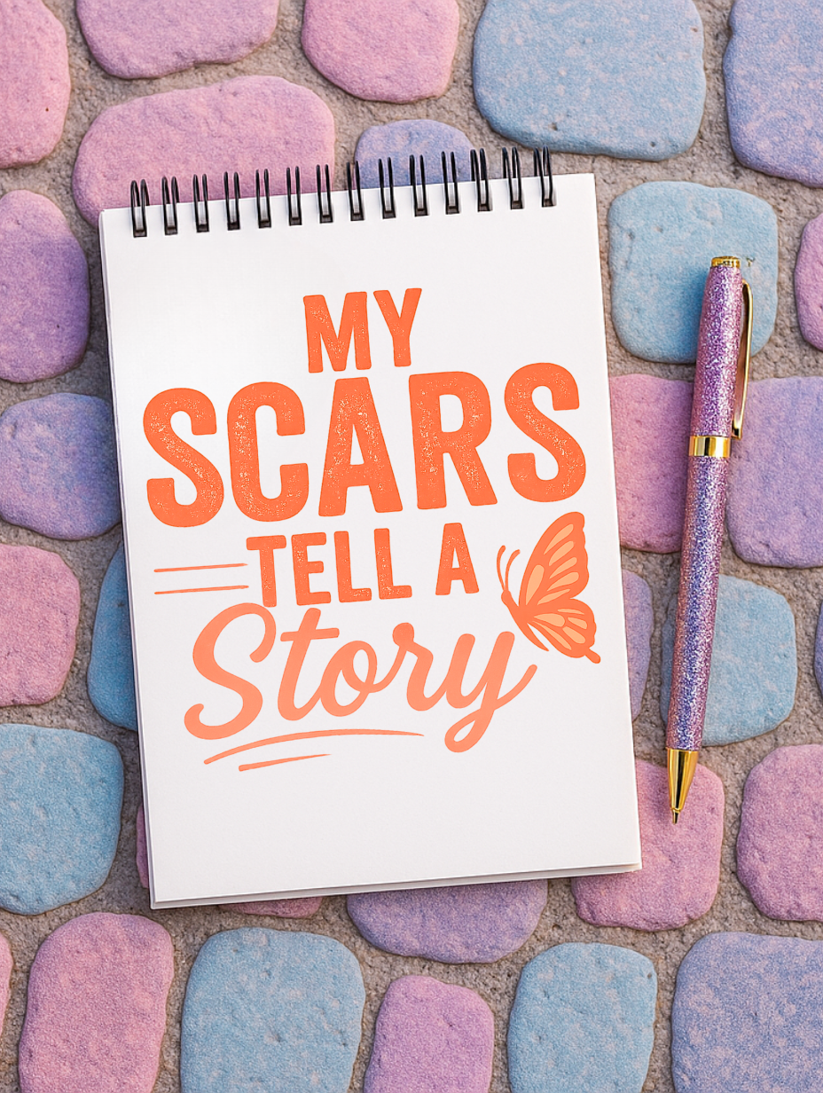 Every scar speaks strength, survival, and growth—and this bold, heartfelt design celebrates that truth. Featuring the uplifting phrase “My Scars Tell a Story” in a mix of distressed bold and elegant script fonts, this digital design is both raw and empowering. The delicate butterfly adds a touch of transformation and grace, symbolizing healing and new beginnings. Perfect for journals, shirts, mugs, wall prints, and more—this design turns pain into purpose.