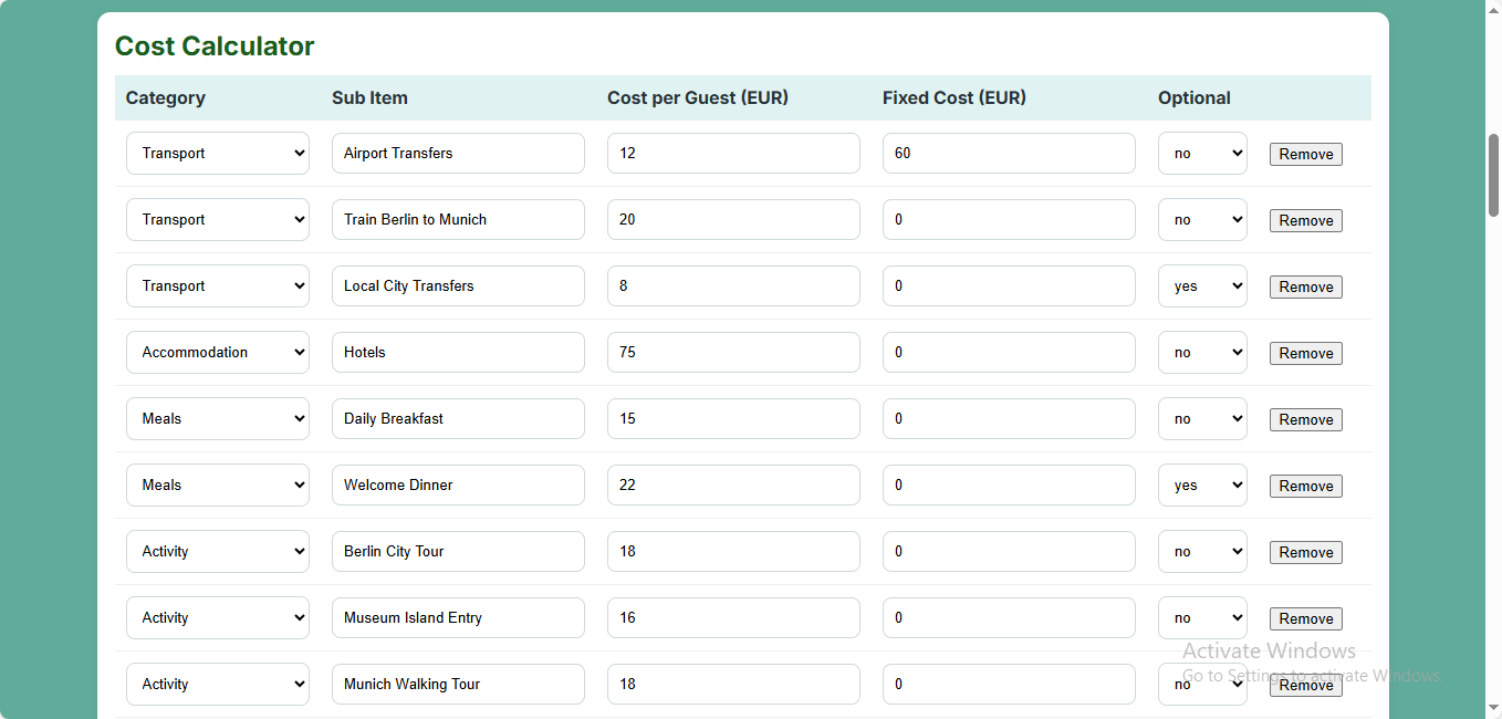 Add costs for activities, lodging, transport, guides, and more.