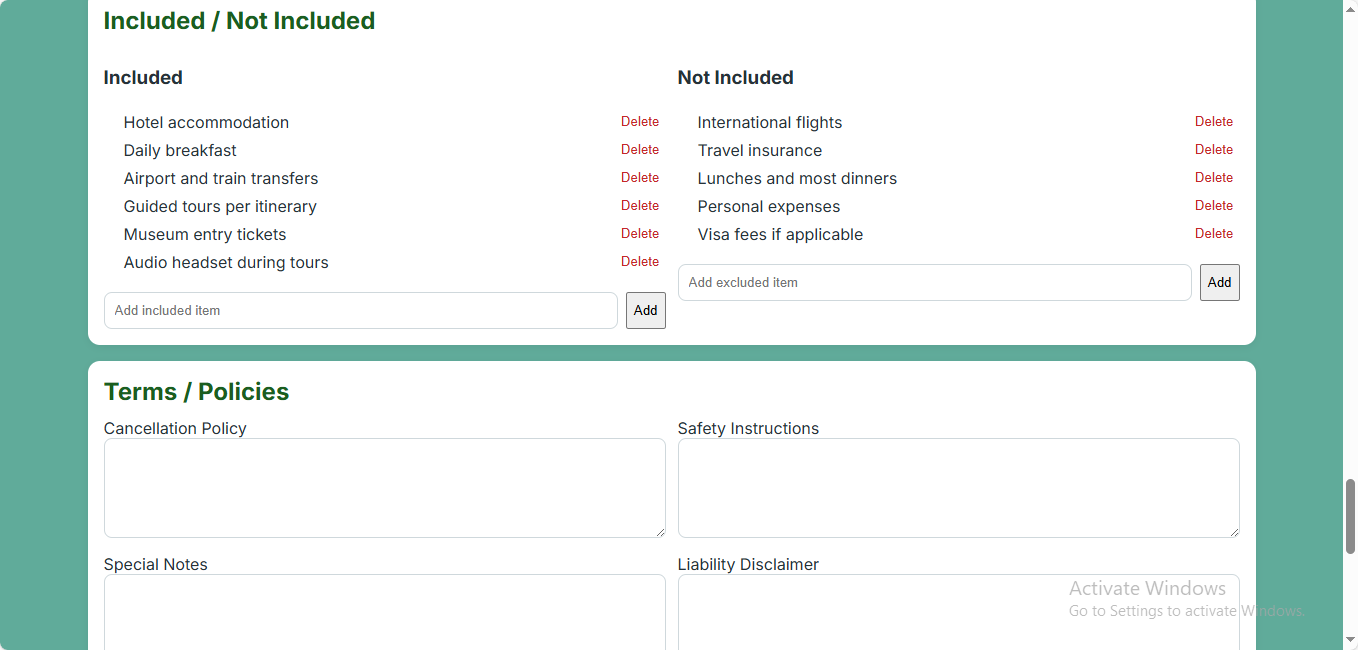- Add activities, inclusions, transportation, lodging, and notes