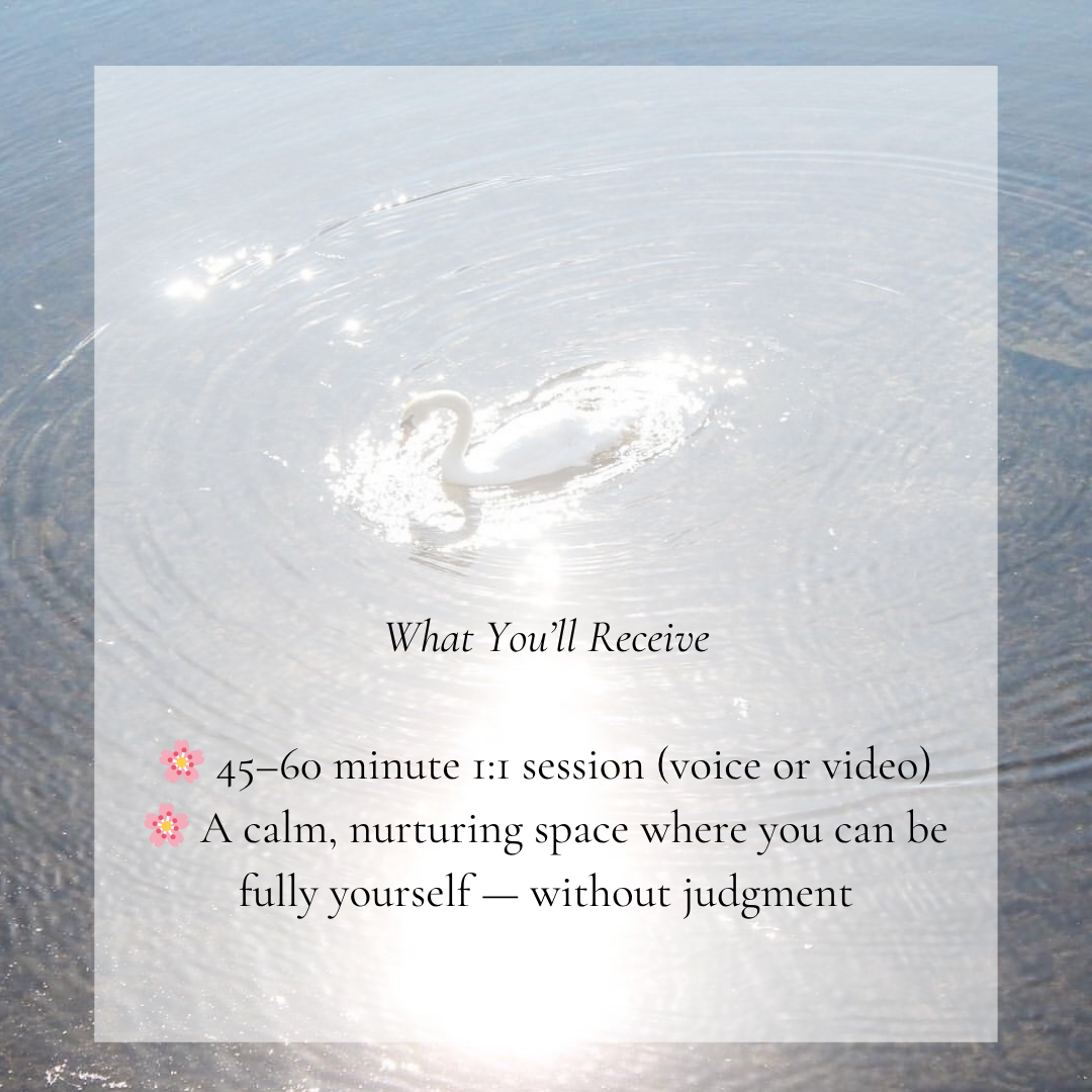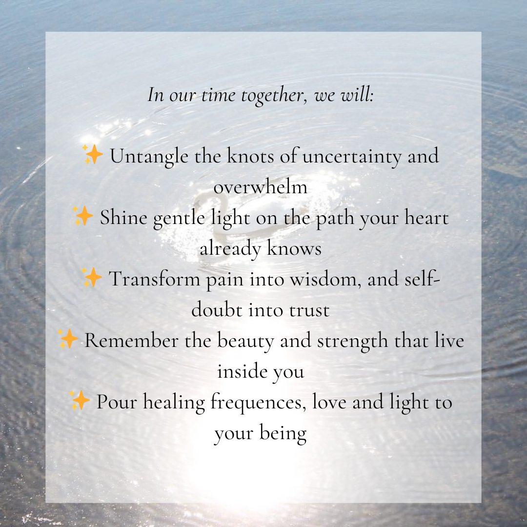 Each session is guided by your energy — no scripts, no judgment, only presence, empathy, and love. I help you transform uncertainty, heartache, or overwhelm into clarity, self-trust, and gentle empowerment.