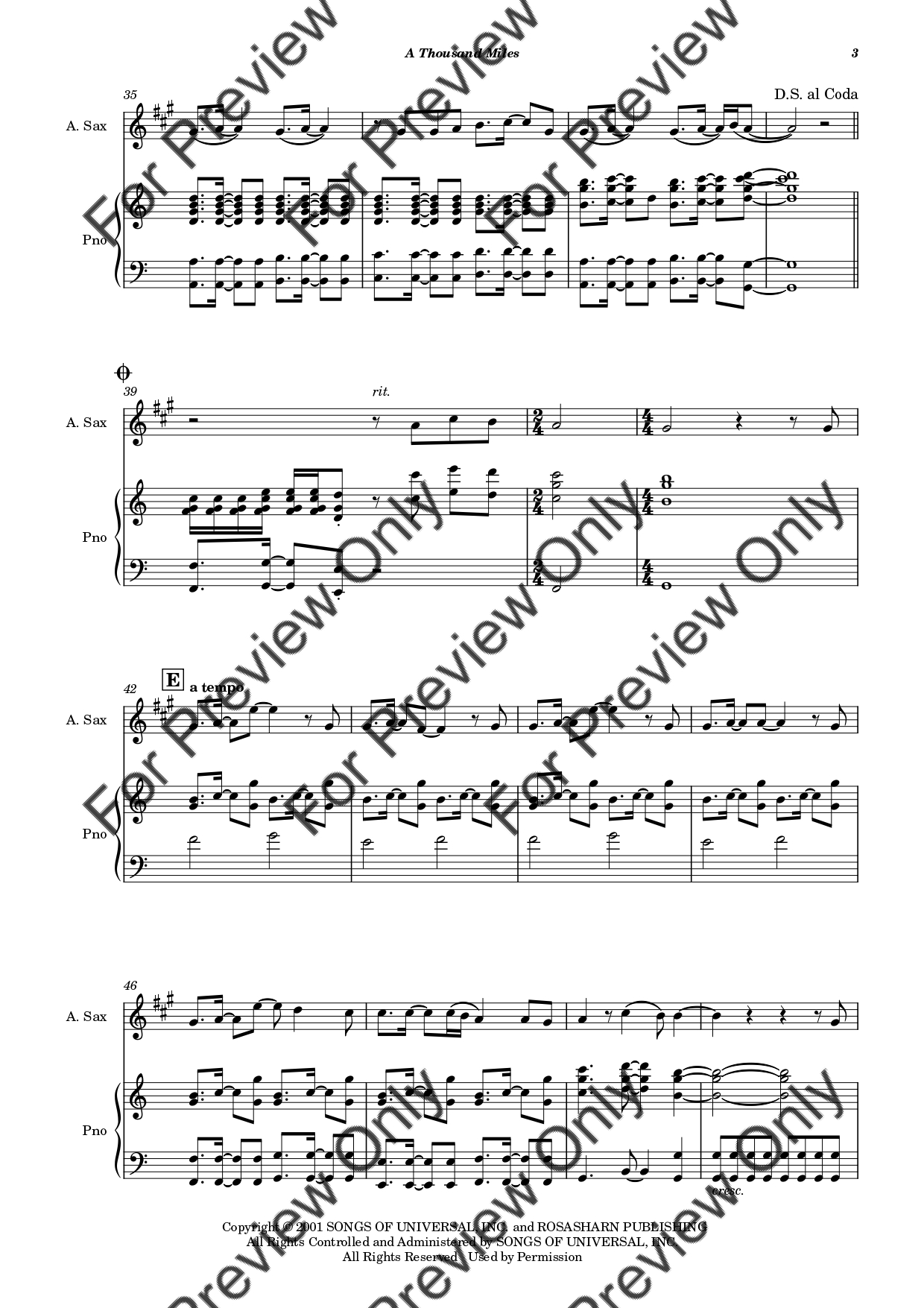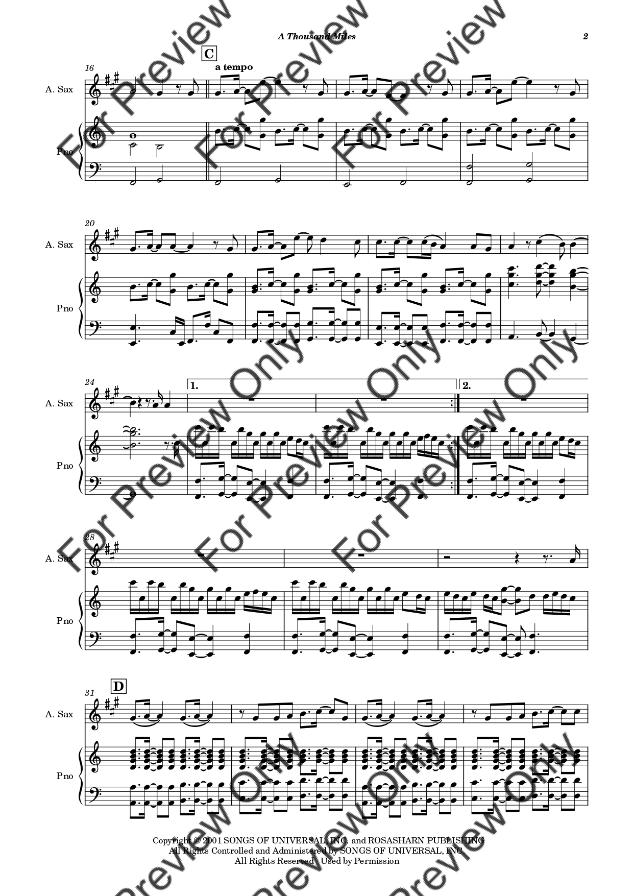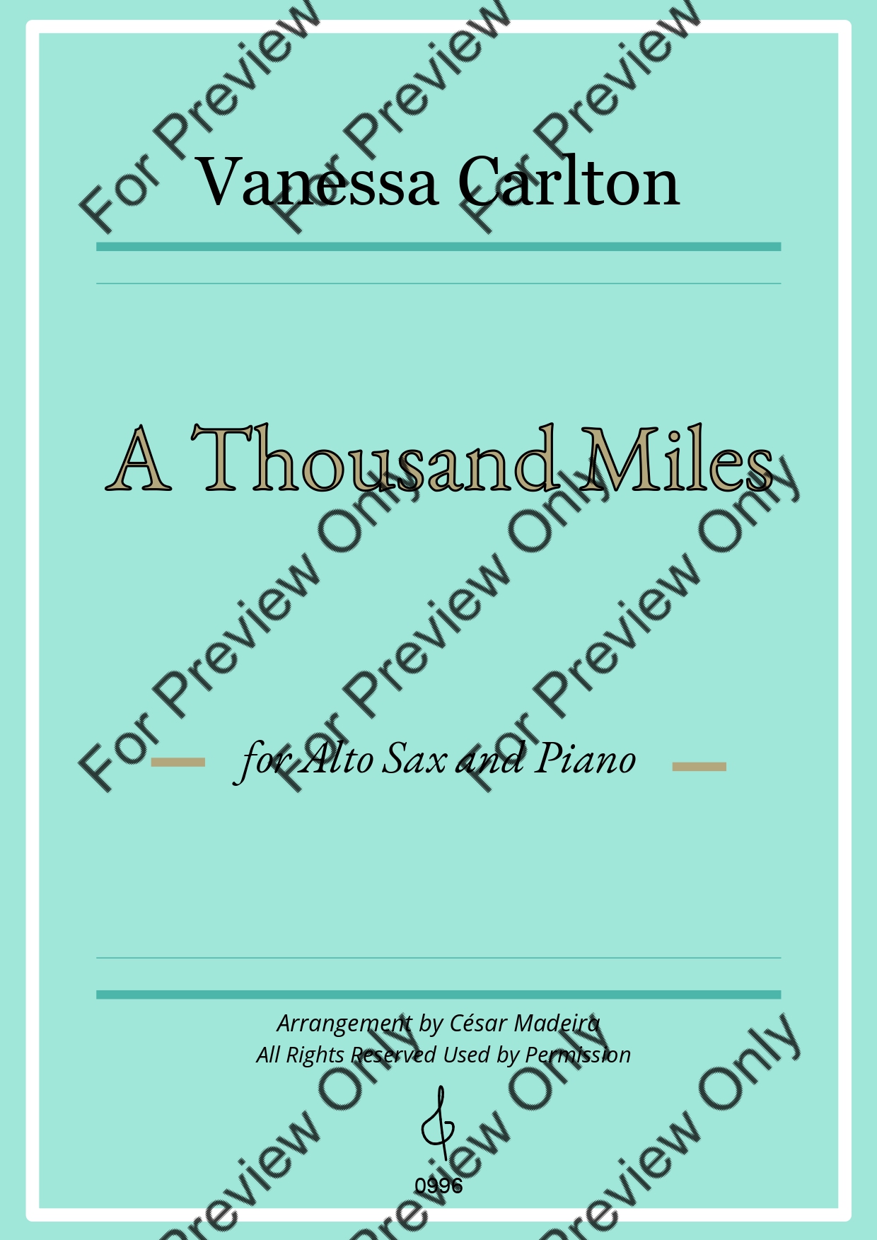 A Thousand Miles by Vanessa Carlton. Arrangement for Alto Saxophone and Piano. With Full Score and Individual Parts. Have fun!