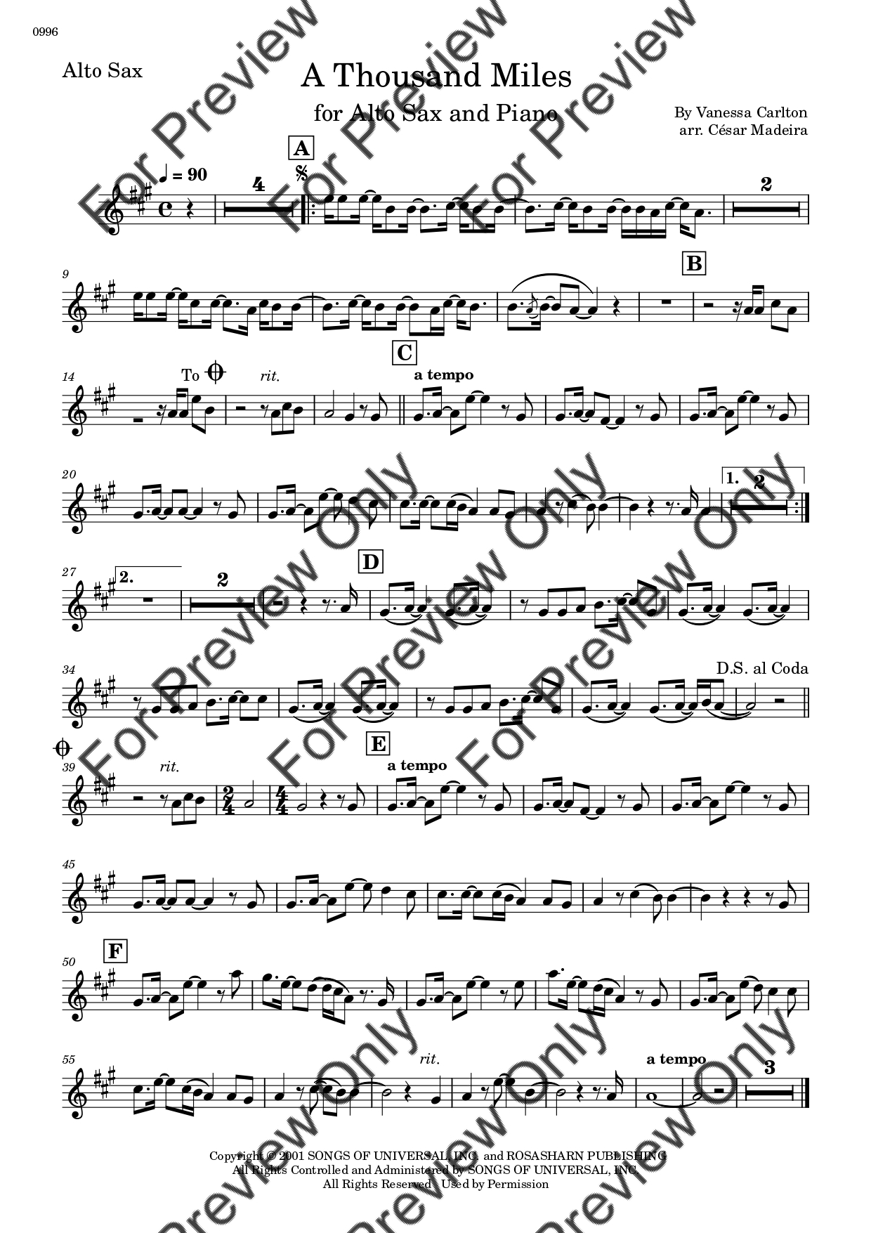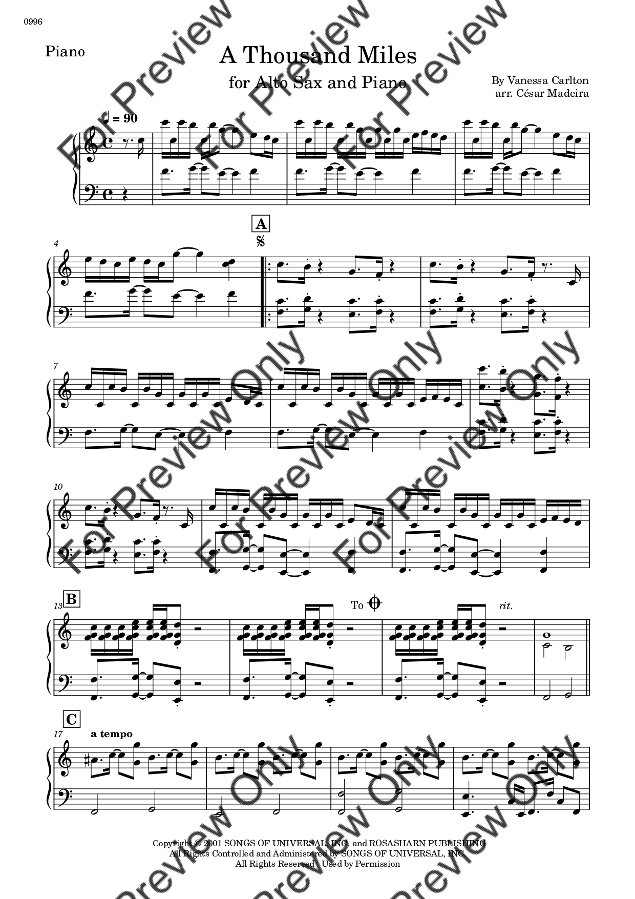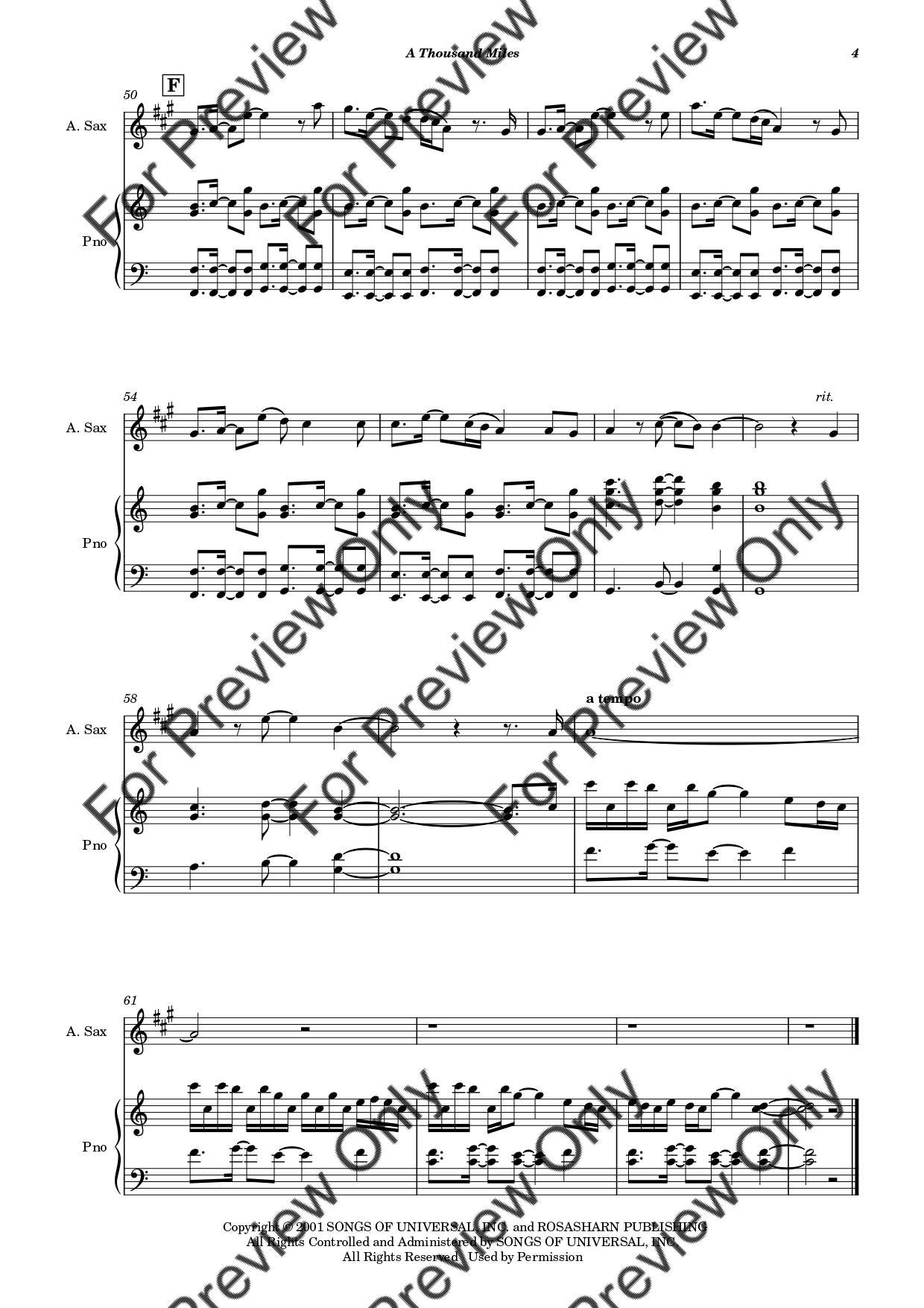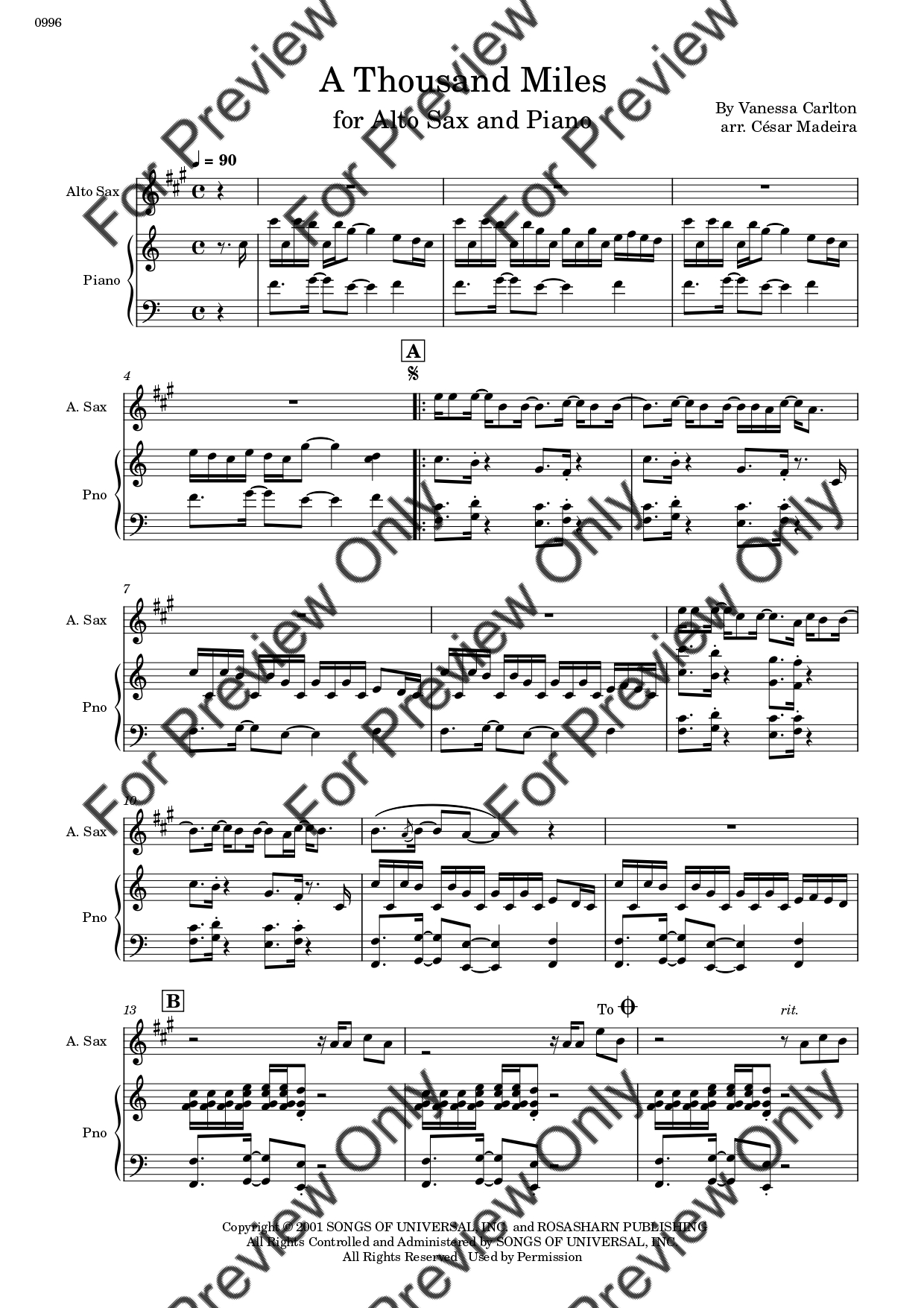 A Thousand Miles by Vanessa Carlton. Arrangement for Alto Saxophone and Piano. With Full Score and Individual Parts. Have fun!