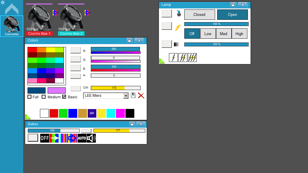 • Accesos directos a Colores Básicos: Blanco, Rojo, Verde, Azul, Ambar, UV, Amarillo, Celeste y Magenta.