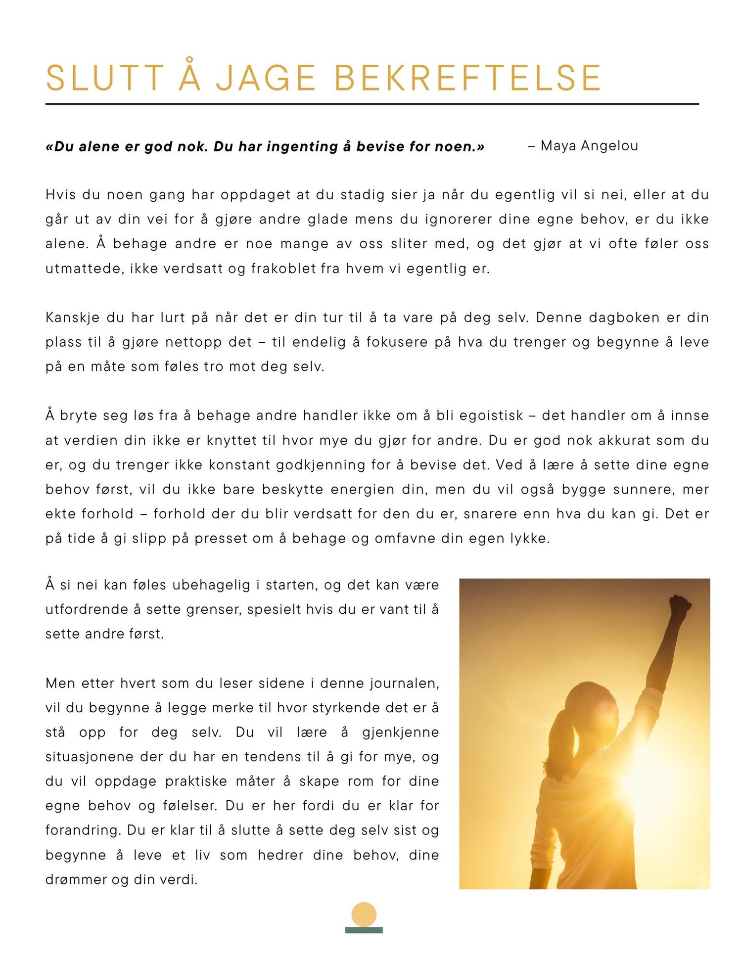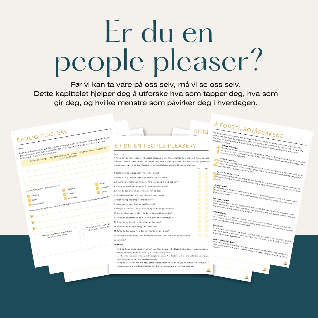 Stop People Pleasing er mer enn bare en bok – det er en reise tilbake til deg selv. Gjennom konkrete refleksjonsoppgaver, daglige sjekker og verktøy for grensesetting lærer du å ta vare på deg selv, sette grenser og bygge opp selvtillit.