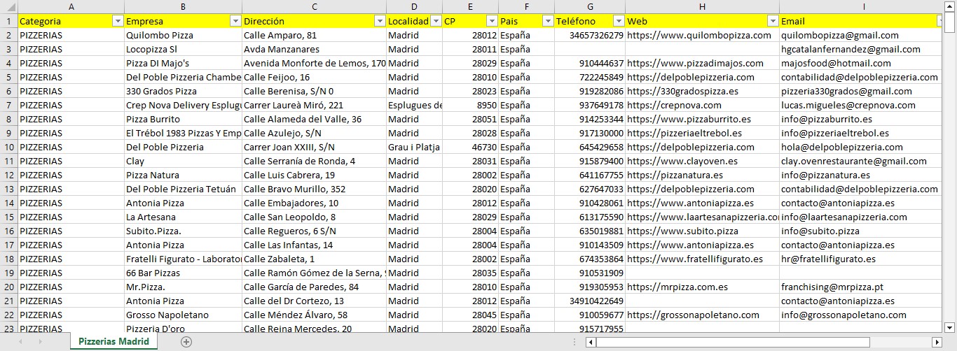 Completa Base de datos de Pizzerias de Madrid, organizada en formato Microsoft Excel, con todos los datos de contacto.