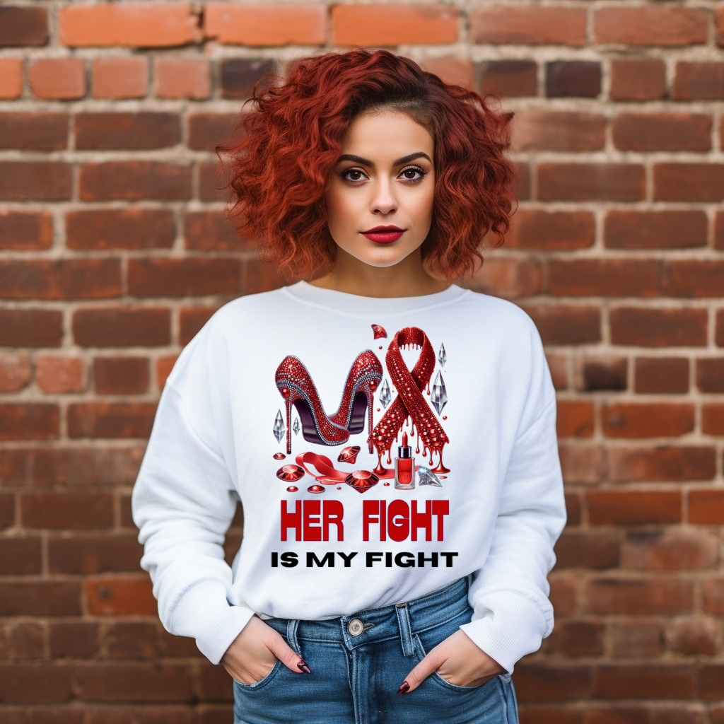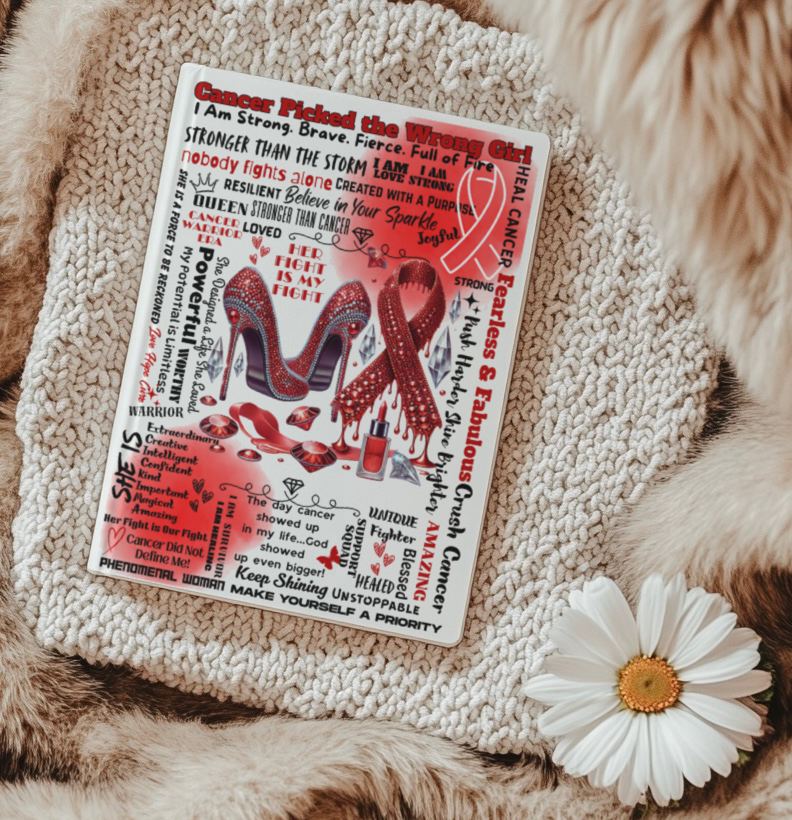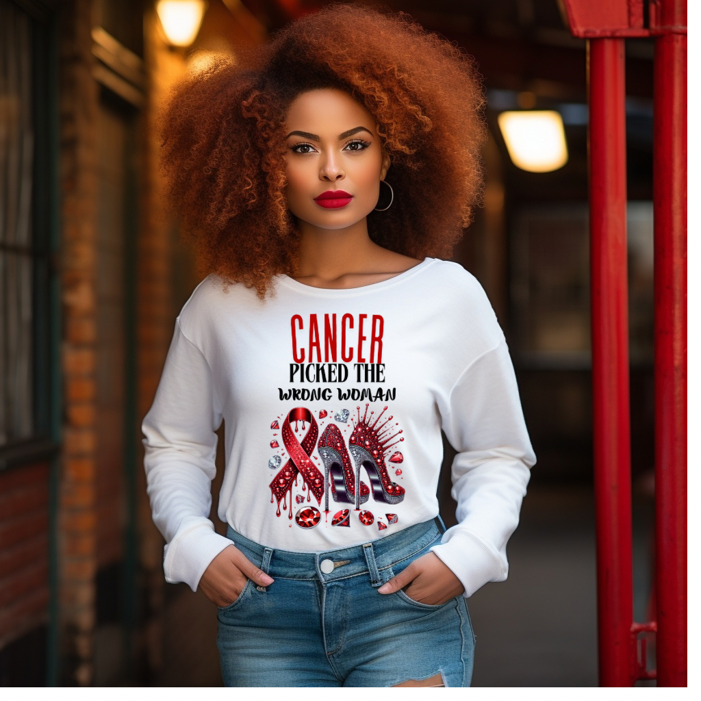 This Red Cancer Awareness Bundle radiates strength and resilience! Featuring dazzling red rhinestone heels, dripping ribbons, and empowering affirmations like “Her Fight is My Fight” and “Cancer Picked the Wrong Woman.”