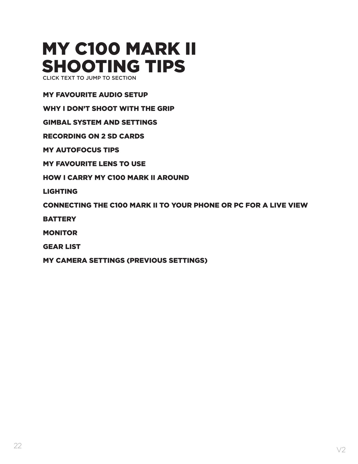 That's why I created this practical 46-page guide. For $19.99, my goal is to save you hours and hours of research plus trial and error. I've used my Canon C100 MK II for 4 years doing weddings, music videos, and corporate shoots for a lot of happy clients. I've also used it for my passion projects and short films.