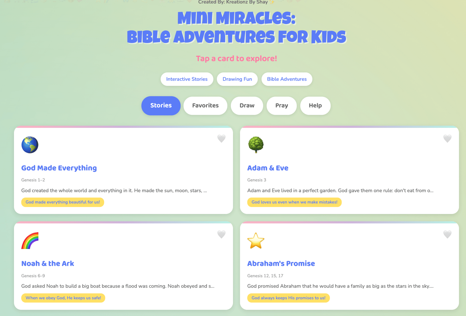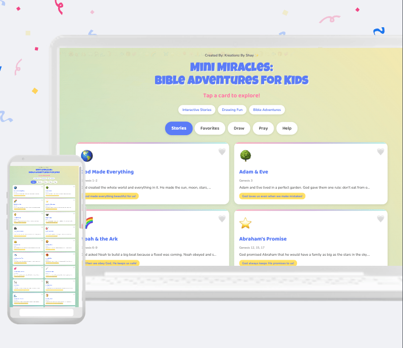 Mini Miracles: Bible Adventures for Kids is a digital experience designed to teach timeless Bible stories in a way children can understand, enjoy, and remember. With simple lessons, playful visuals, and guided reflections, this interactive hub helps your child grow in faith — one story at a time!