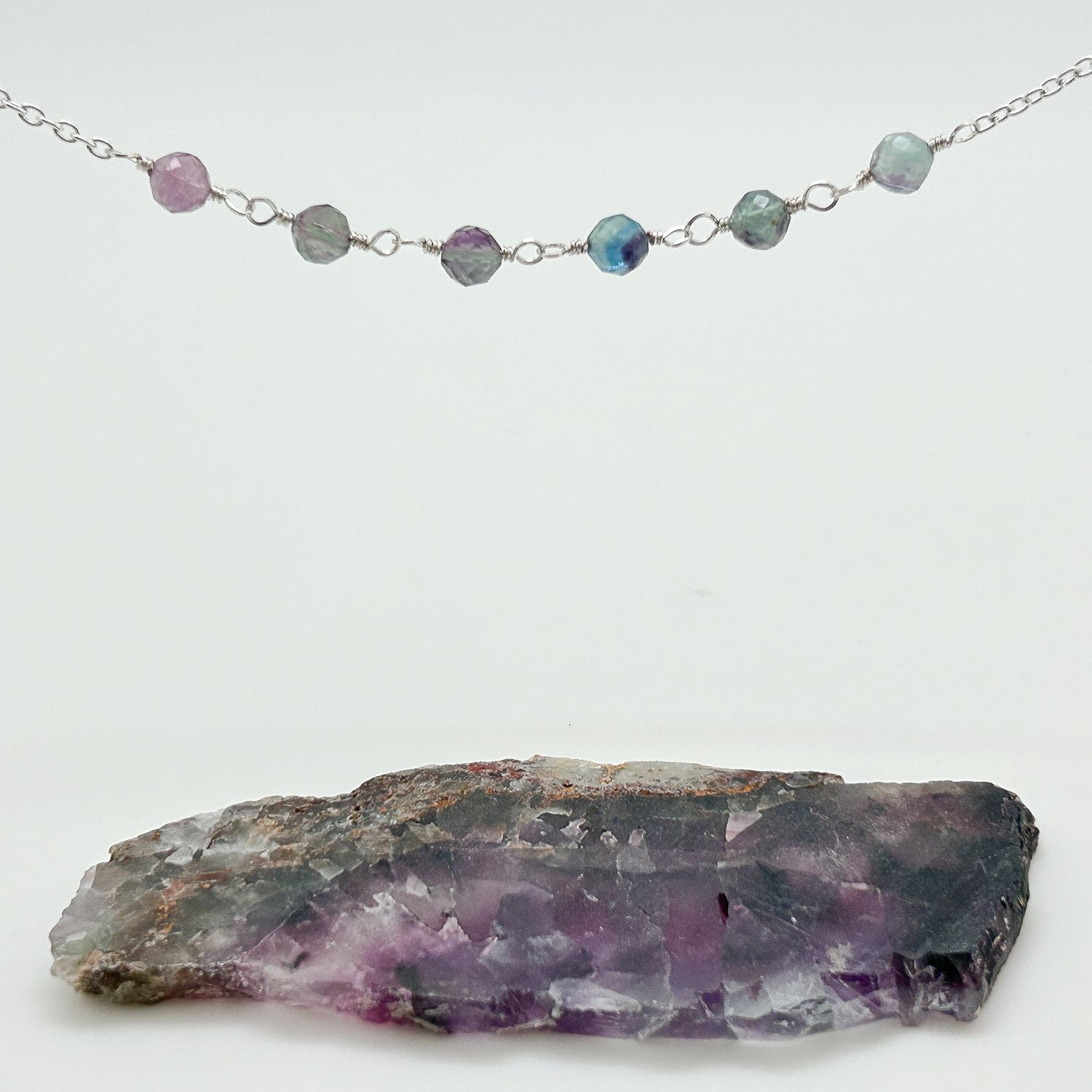 Here's what I know to be true: six faceted Fluorite beads, each a small prism of green, violet, and twilight blue, are strung along a silver-plated chain and anchored with sterling-plated wire. The colors shift gently, like thoughts finding their place. Fluorite clears the mental noise, strengthens your inner voice, and restores balance to your emotional field. The silver adds a touch of clarity and protection, keeping your energy grounded while your spirit explores.
