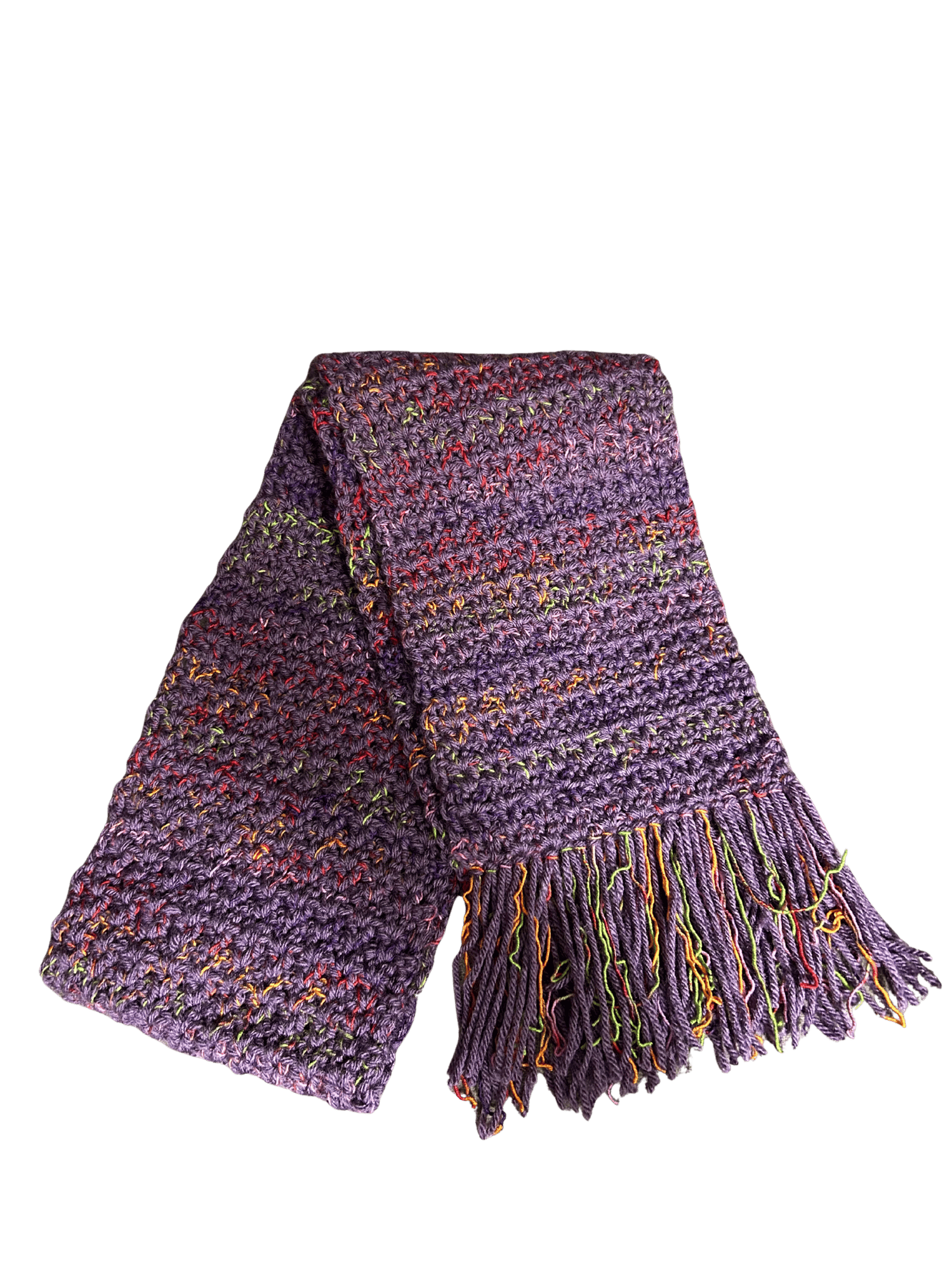 Handmade crochet purple scarf with multi color woven throughout. Approximately 54" x 7".