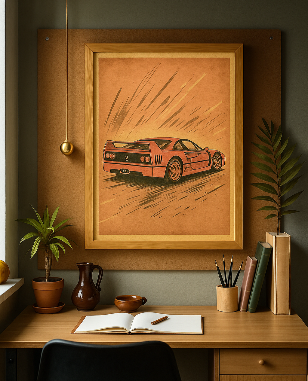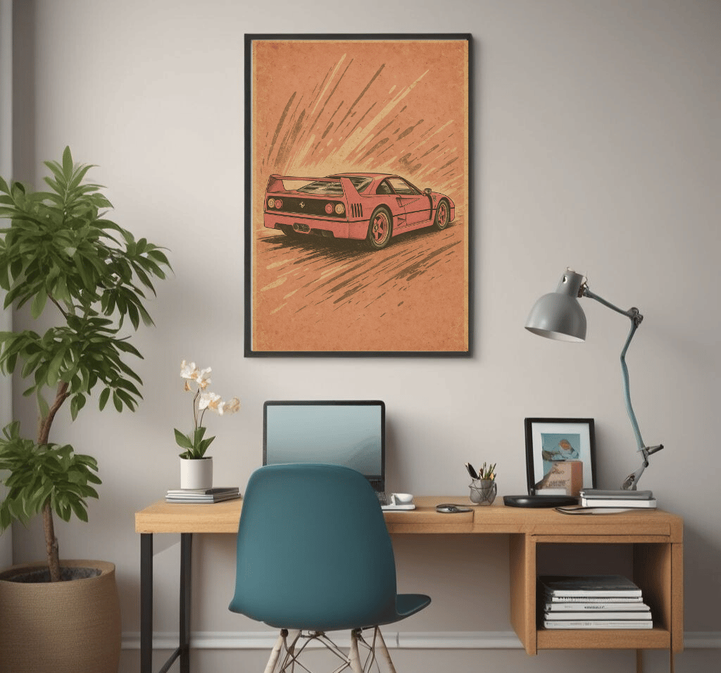 Fuel your space with the spirit of speed and style with Retro Racer, a high-energy digital art print featuring an iconic 80s supercar in motion. Designed in a bold comic-book style with vintage textures and warm tones, this piece captures the thrill of classic performance machines and the golden era of racing aesthetics.