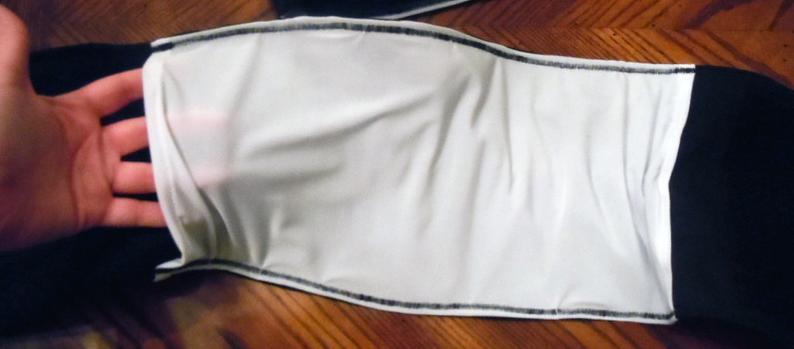 Now, if you also choose the pocket AND the elastic option, you will follow the steps above for the pocket panel, BUT, and this may take a third hand from someone, or use your chest, and stretch and pin the stitch lines of both sides of the elastic stitch box pocket line, together, start with the ends, join and pin them, then carefully sew the stitch lines together, making sure that the stretch nylon pocket panel is rolled in and out of the way, stretch the piece as you go. You can use the outer fabric's thread color, and zig zag stitch around your straight stitch for the elastic pocket, or don't, your choice.