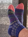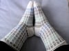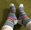 What do you do with all those little leftover balls of fingering weight yarn? Bring them together for a fun pair of socks! With this simple pattern, you can use up all those little balls, orphan skeins of yarn, or simply indulge your color fantasies! Quick and easy, these make a fun and feet-warming gift for you or a friend!
