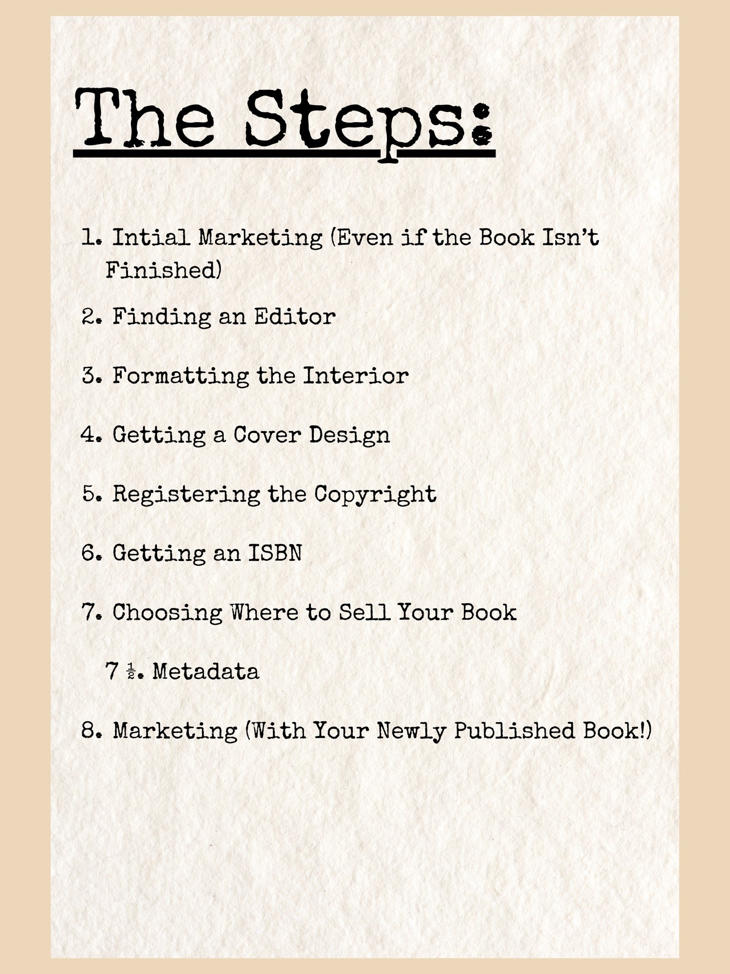 These 24 pages go in-depth on the essential self-publishing steps: initial marketing, finding an editor, formatting the interior, getting a cover design, registering for copyright, getting an ISBN, choosing where to sell your book, metadata, and post-publication marketing.