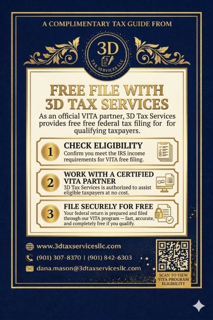 Tax season doesn’t have to be a source of anxiety or a drain on your wallet. At 3D Tax Services LLC, we believe that everyone deserves access to high-quality, professional tax preparation, regardless of their budget. As an official VITA (Volunteer Income Tax Assistance) partner, we are proud to offer specialized federal tax filing services that are fast, accurate, and—most importantly—completely free for qualifying taxpayers.