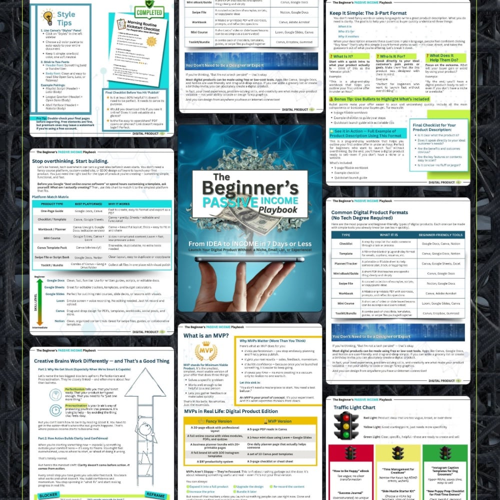 The Beginner’s PASSIVE INCOME Playbook is a step-by-step digital guide and workbook designed for aspiring creators, service providers, or side-hustlers who have tons of ideas but struggle with niche clarity, tech overwhelm, or simply knowing where to start. It’s especially helpful for folks with ADHD, creative burnout, or multi-passionate minds who crave structure without pressure. This playbook walks you through every step of creating and launching your very first digital product—guiding you from messy brainstorms to a ready-to-sell digital product in just 7 days or less.
