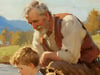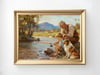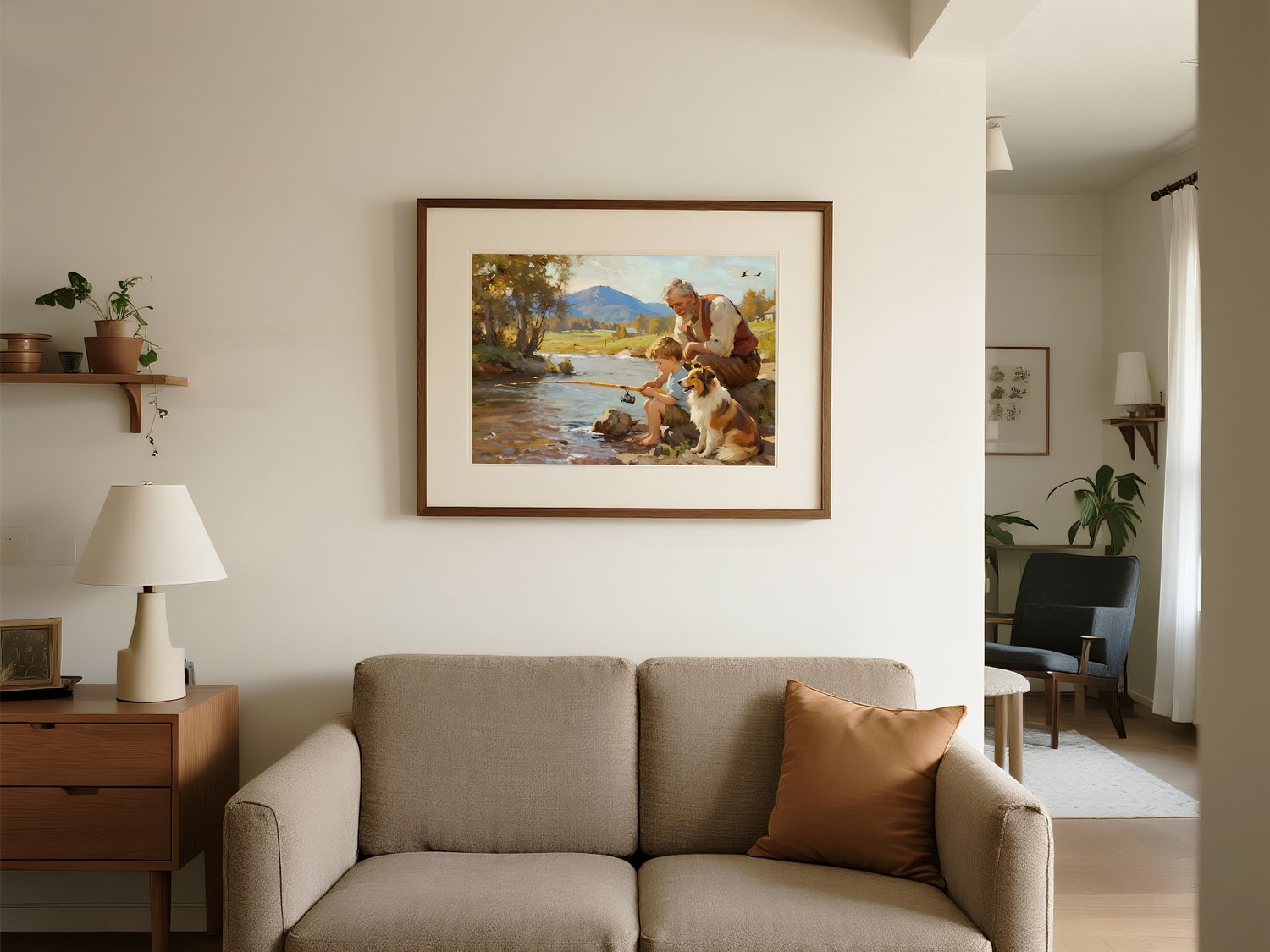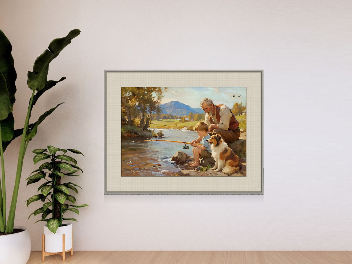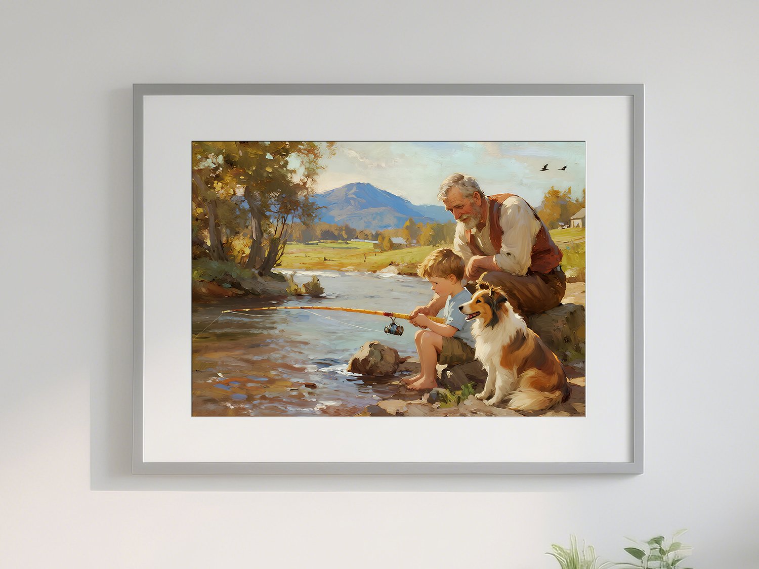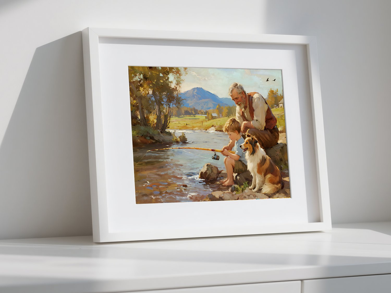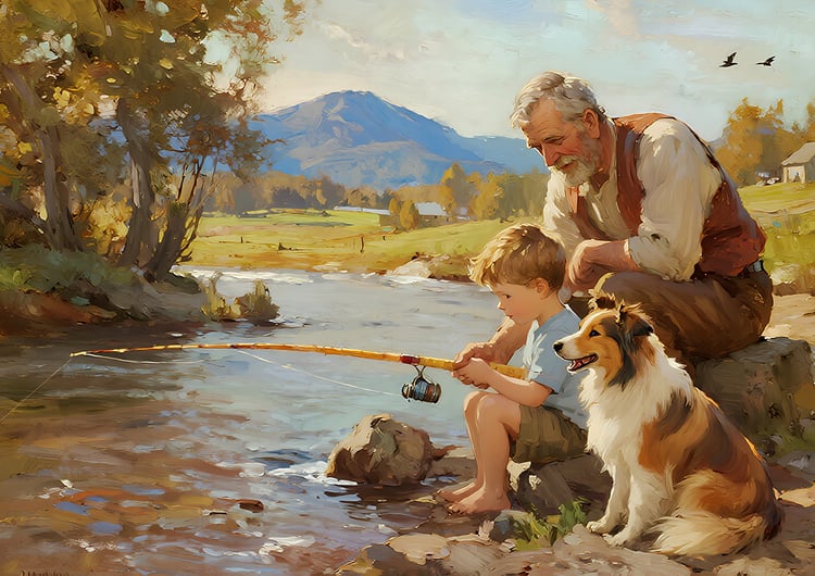 This artwork beautifully captures a heartwarming moment of a grandfather, his grandson, and their loyal dog fishing by the riverside. The piece evokes a sense of nostalgia and serenity, transporting the viewer into a timeless countryside scene.
