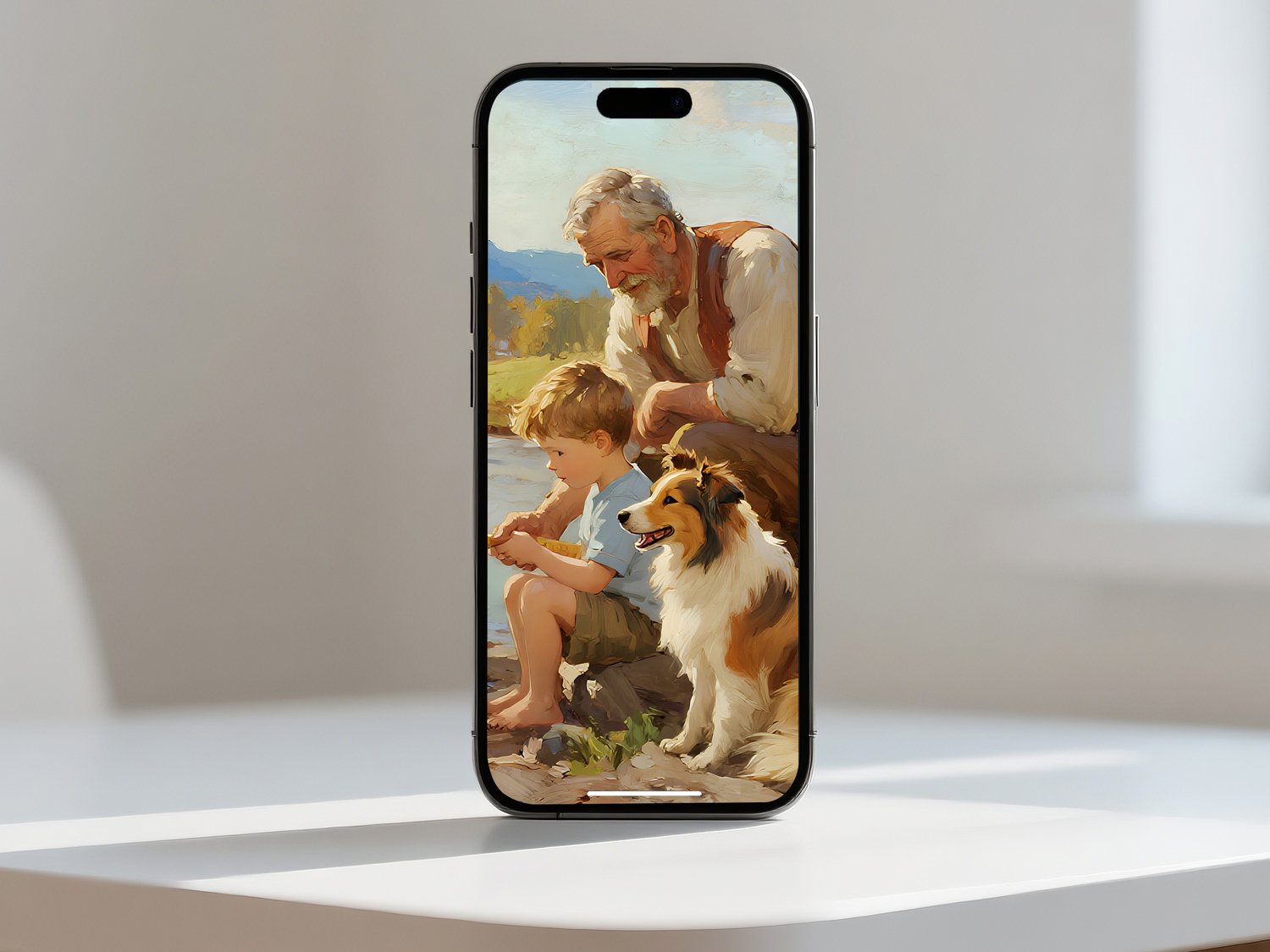 Riverside Moments – Nostalgic Art of Grandfather, Grandson & Dog uk052