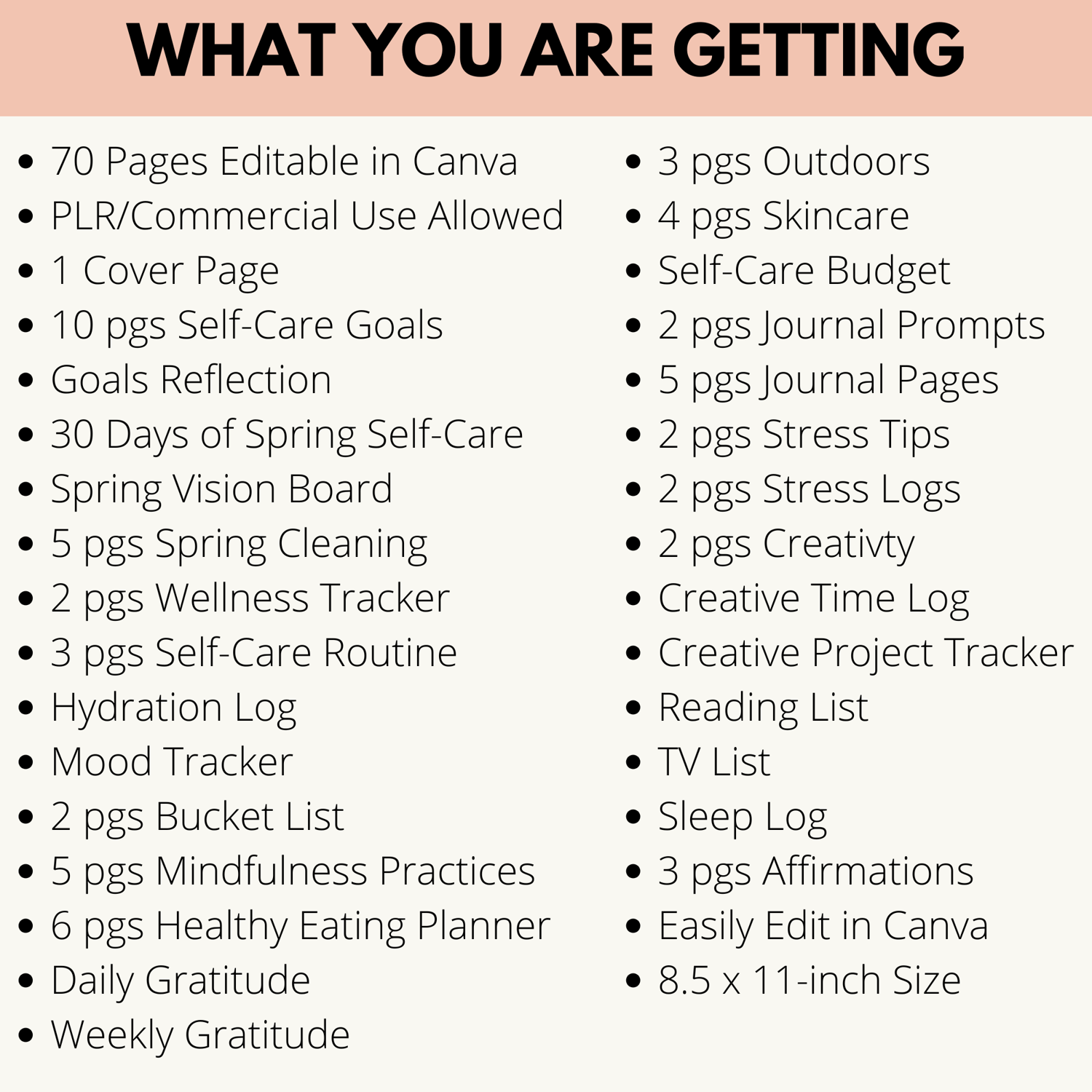 The Spring Into Self-Care Planner PLR is a beautiful template that you can easily edit in Canva and make your own to sell it to your audience. They won't be able to resist with all the value packed inside the 70 pages.