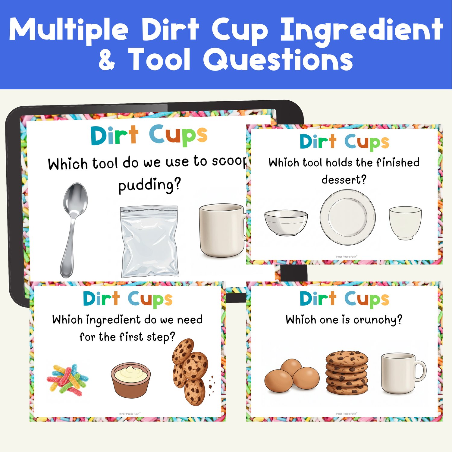 ✔ Multiple ingredient and tool questions related to making dirt cups