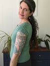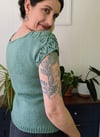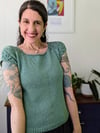 Auri is a romantic tee with a scoop neck and lacy cap sleeves. Knit from a DK weight cotton blend yarn it is a wonderful addition to your handknit summer wardrobe!
