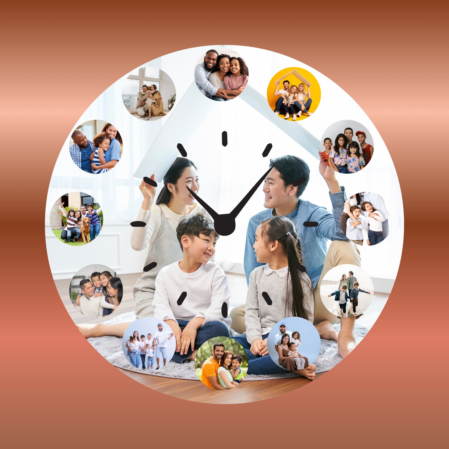 A heartfelt digital creation that turns the face of a clock into a cherished family album. The main image features a loving family moment, while twelve circular photo slots represent the hours, reminding us that time spent with loved ones is the most valuable time of all.