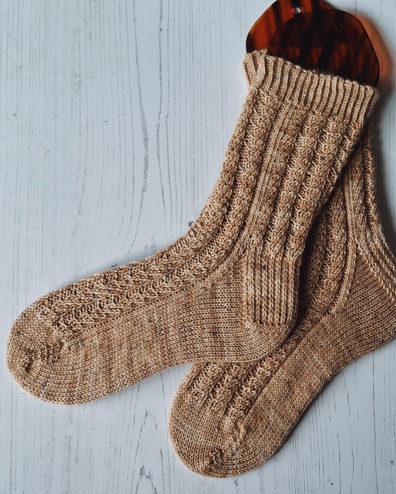 These cuff down unisex socks feature a straightforward cable pattern with a difference. Ideal in a solid colour or semi-solid they are perfect for showing off a skein of hand-dyed sock yarn and the 6-round repeat knits up quickly.