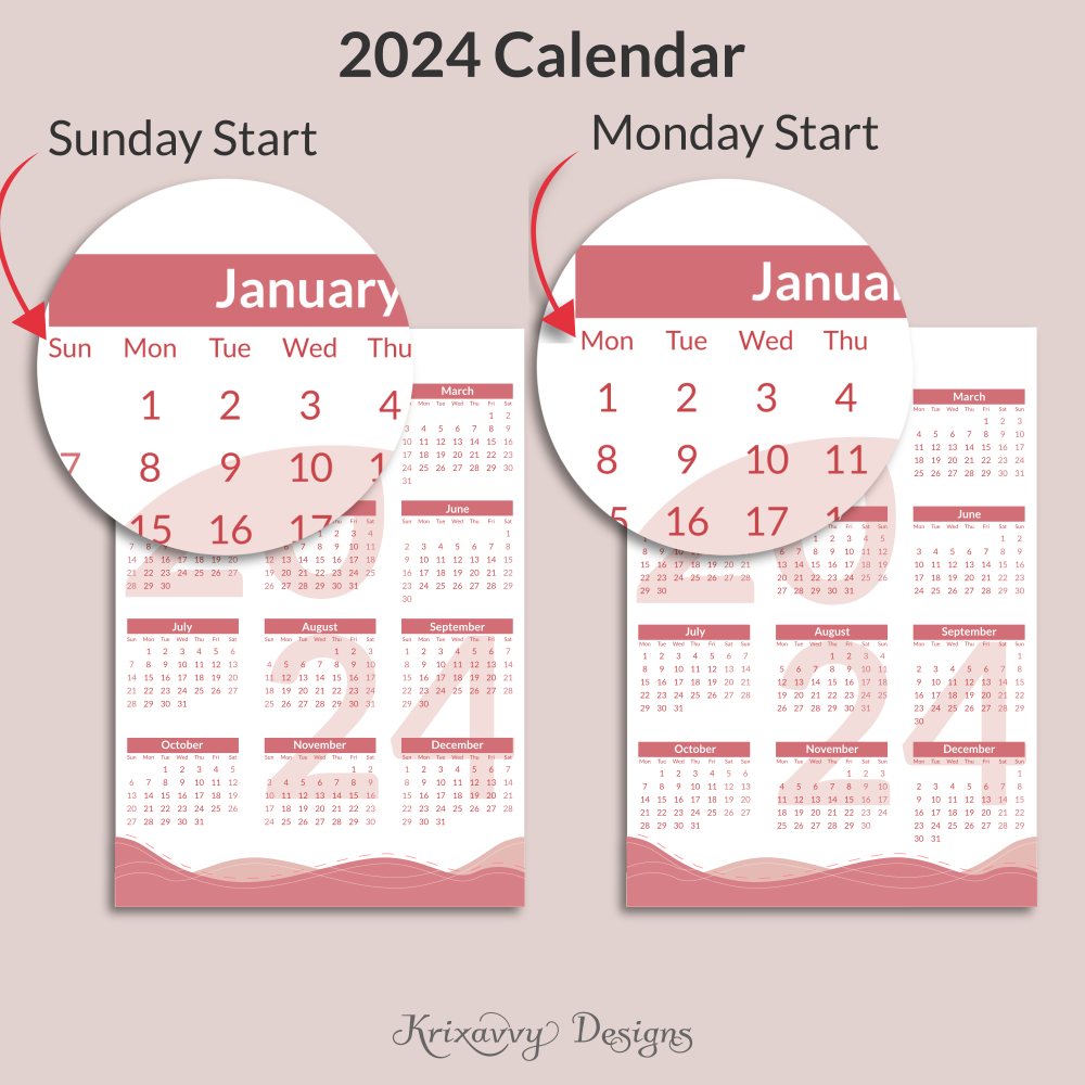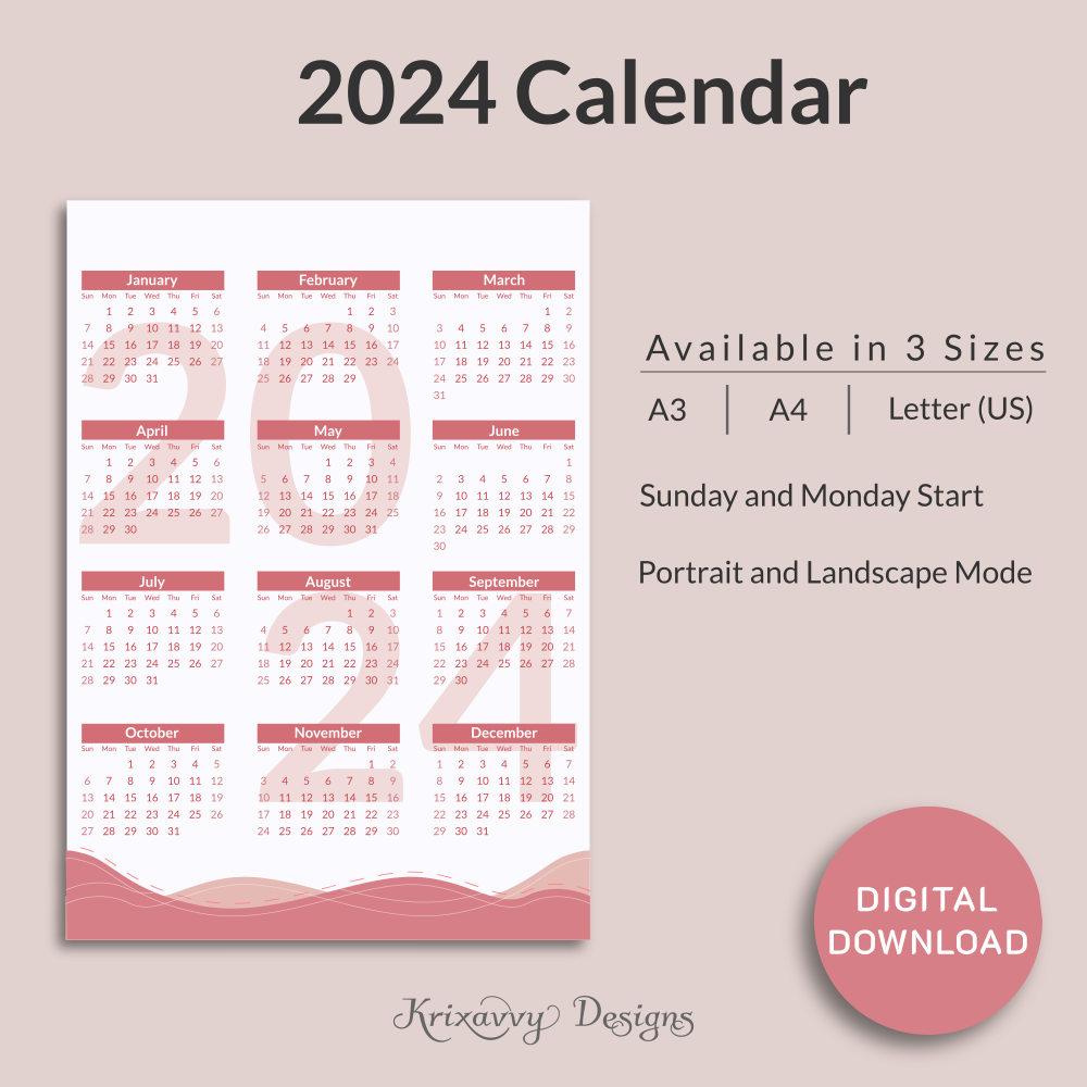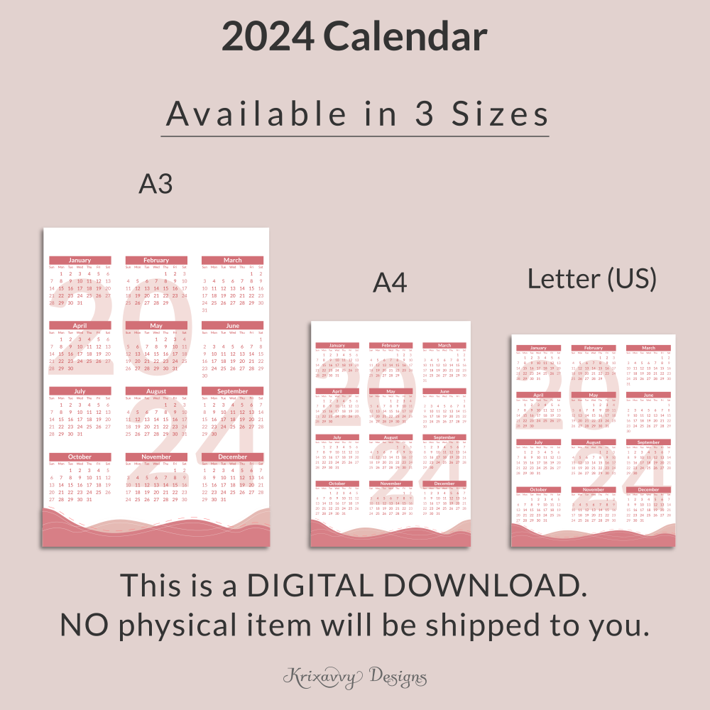 Printable Yearly Calendar | 2024 Calendar | 2024 Dated Calendar | Printable PDF | A4 Size | A3 Size | Letter (US Size) | Pink Color