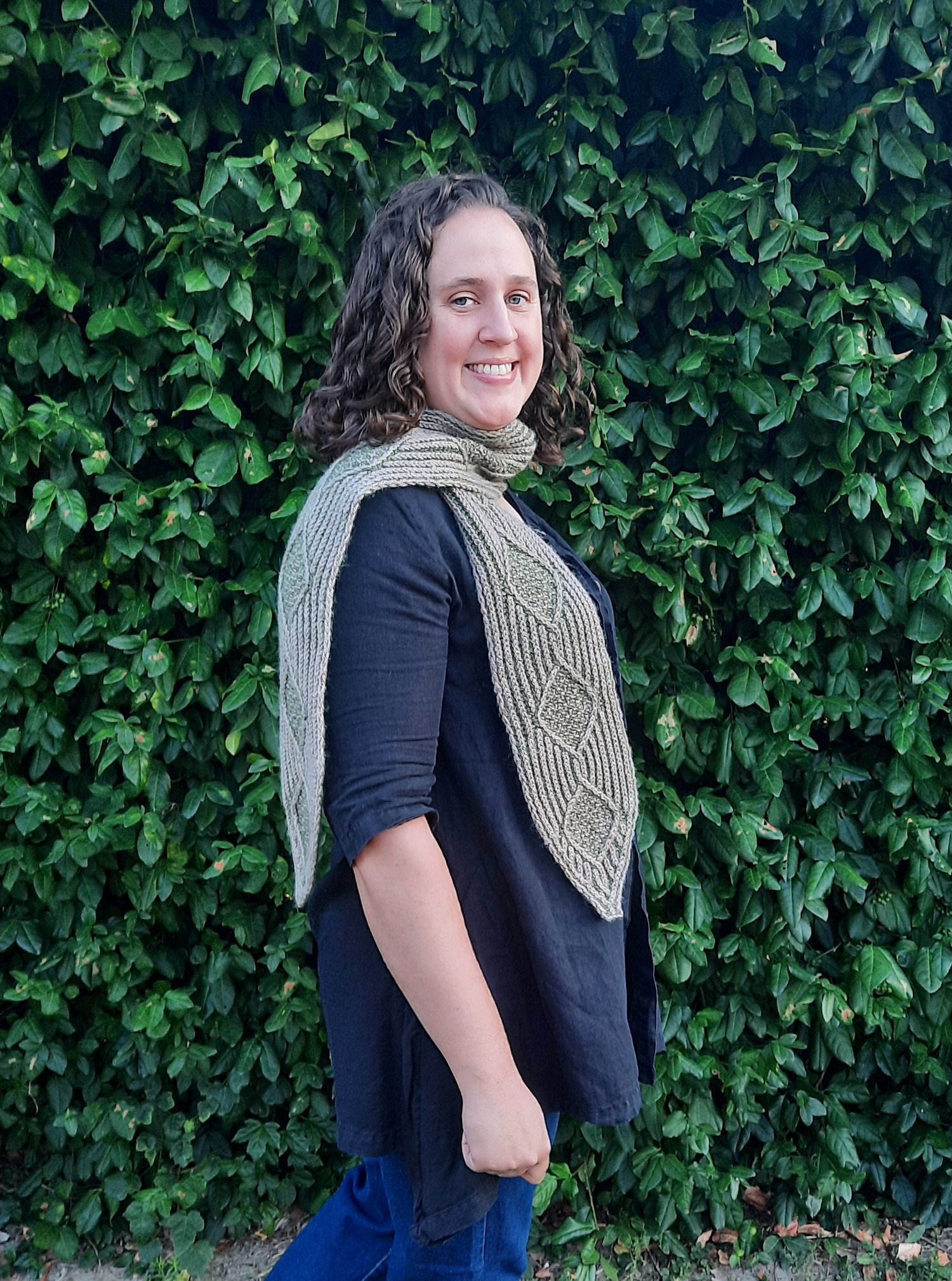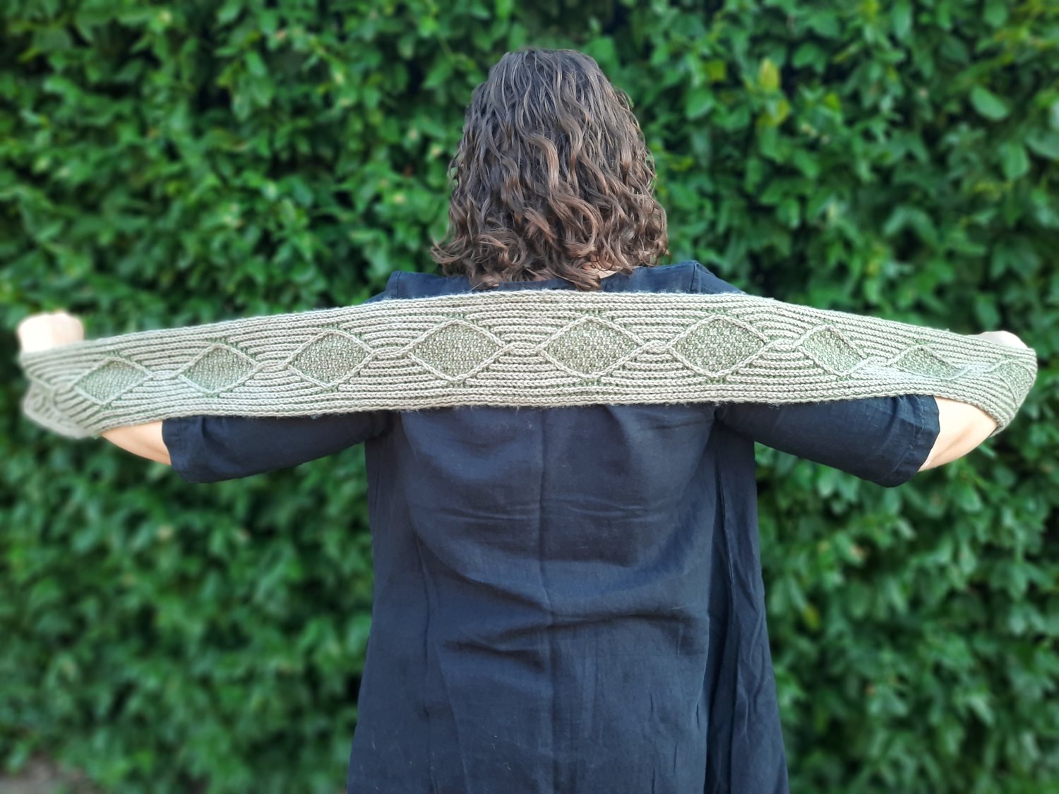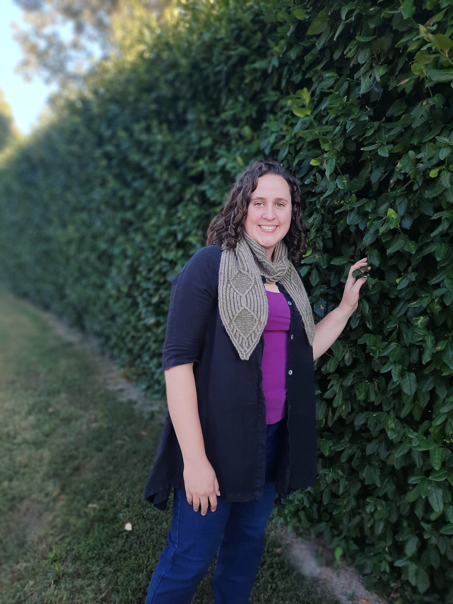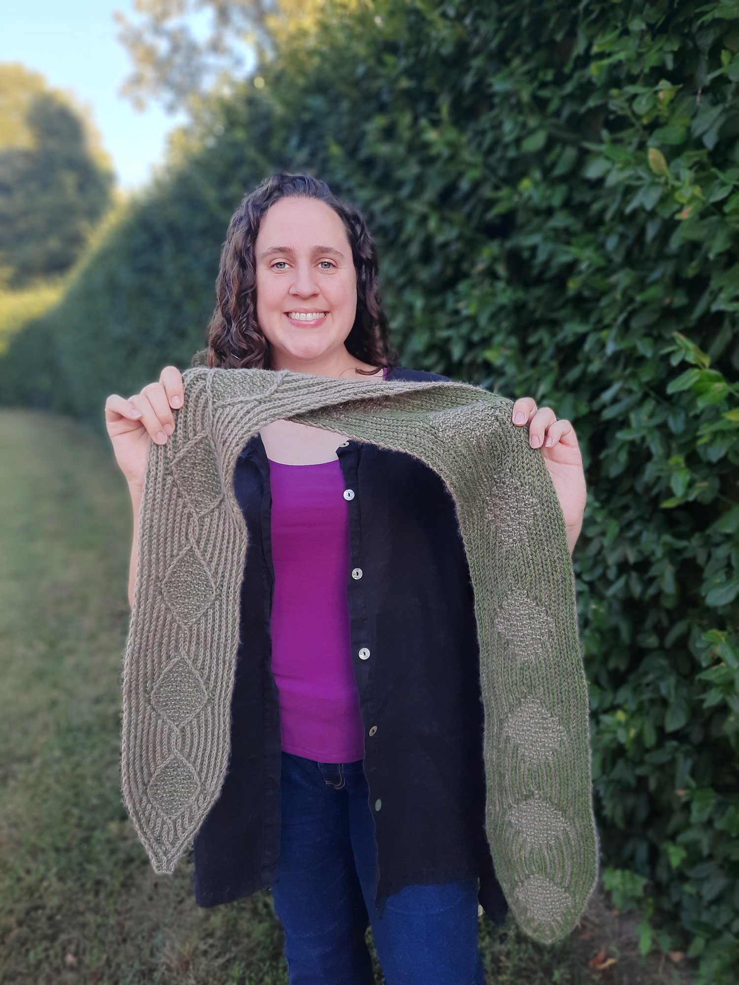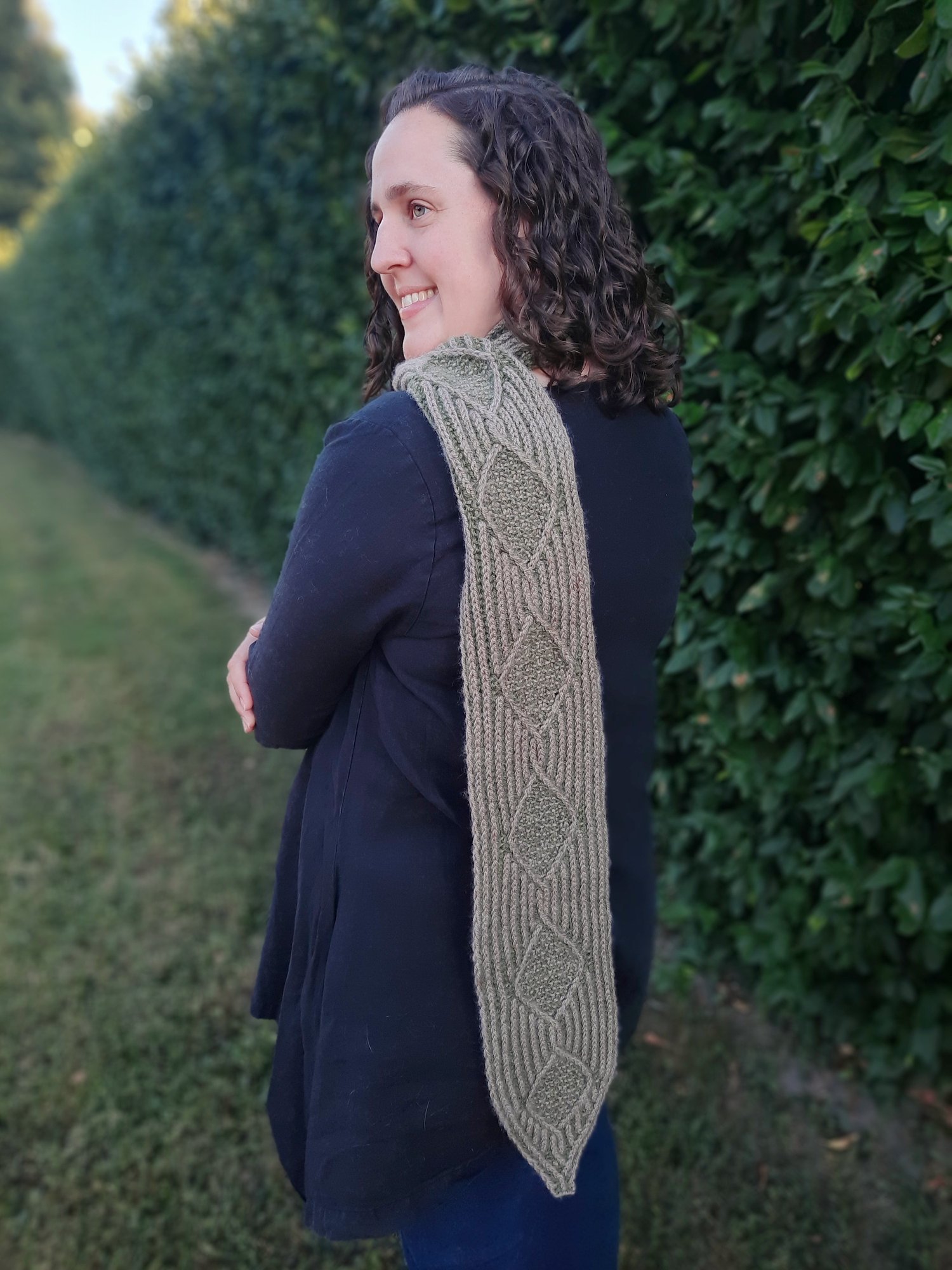 Wrap yourself in timeless elegance with the Hedgerow Scarf—a cozy and sophisticated accessory inspired by the classic beauty of English garden paths. This scarf features brioche rib, a stitch whose texture mimics the appearance of tree bark, with delicate purl valleys that hint at the layers beneath, like the hidden life within the hedgerows. A striking brioche diamond motif brings a modern twist to a traditional moss stitch filled cable, blending heritage and innovation into a single, wearable work of art. Whether you're heading out for a brisk morning walk or adding a statement piece to your outfit, the Hedgerow Scarf offers warmth, texture, and a touch of botanical charm. Designed to be both luxurious and practical, it's the perfect project—and gift—for knitters and nature lovers alike. Inspired by nature. Rooted in tradition. Made to be worn.