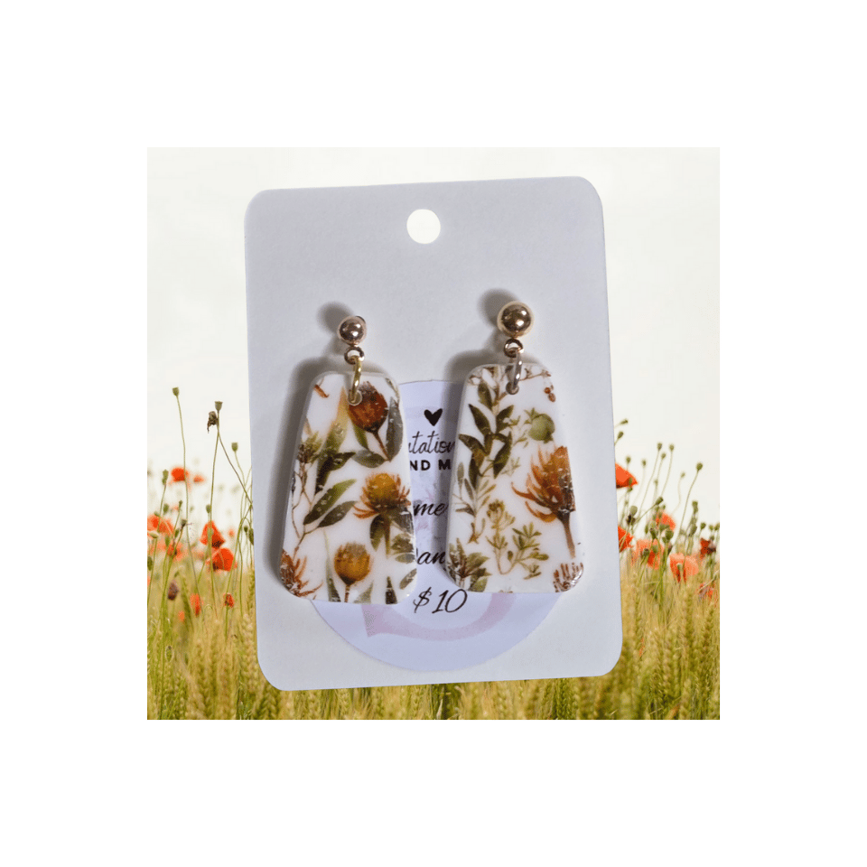 These lightweight polymer clay dangle earrings feature a soft floral pattern with warm, earthy tones. Finished with simple stud posts, they’re easy to wear and add a natural, handmade touch to everyday outfits or casual dress looks.