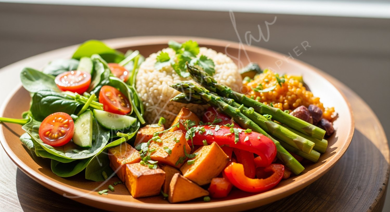 Vegan energy bowl with roasted sweet potatoes, grilled asparagus, brown rice, and fresh spinach salad on a wooden table, sunny natural lighting.