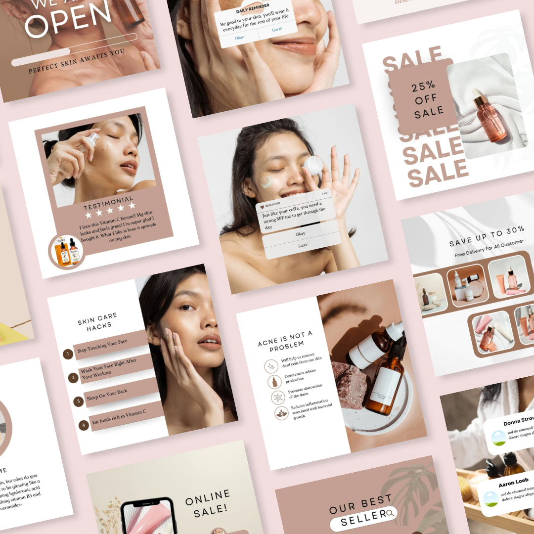 A diverse range of templates to cover all your social media needs, from product showcases to beauty tips, all designed with a luxurious aesthetic.