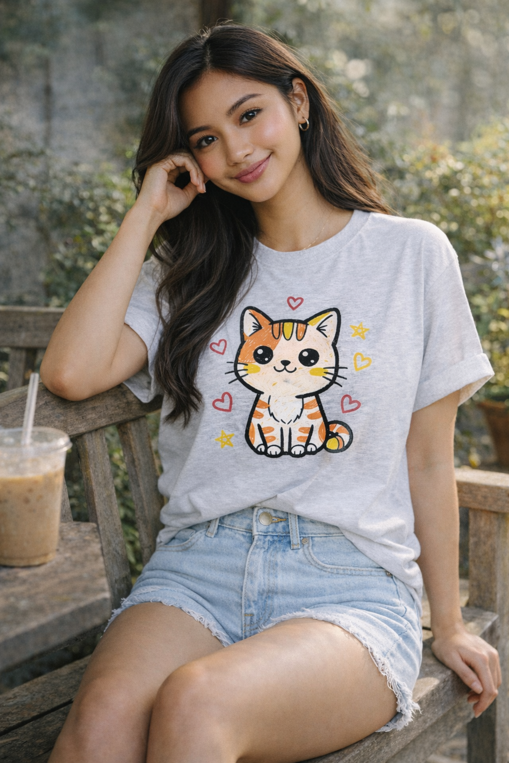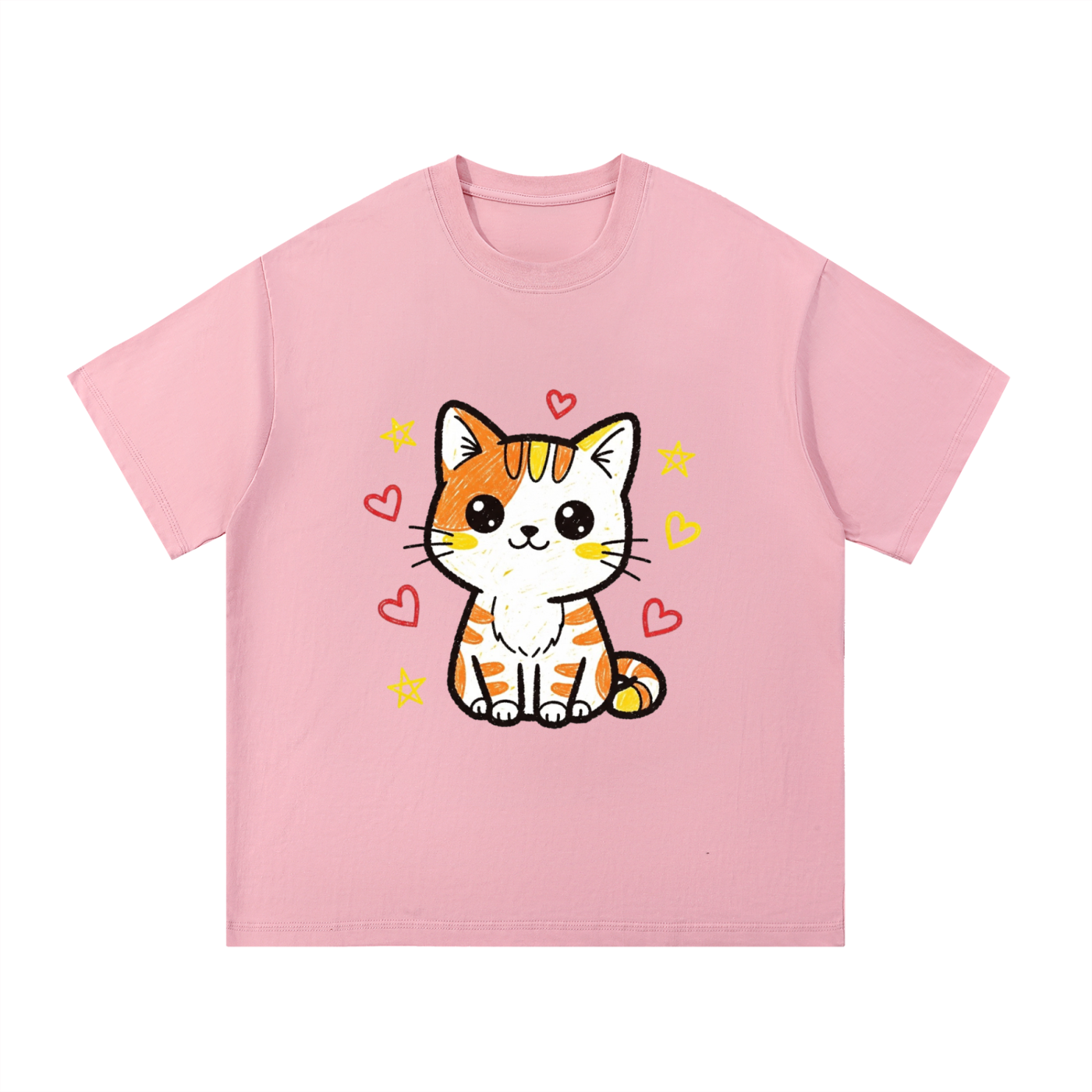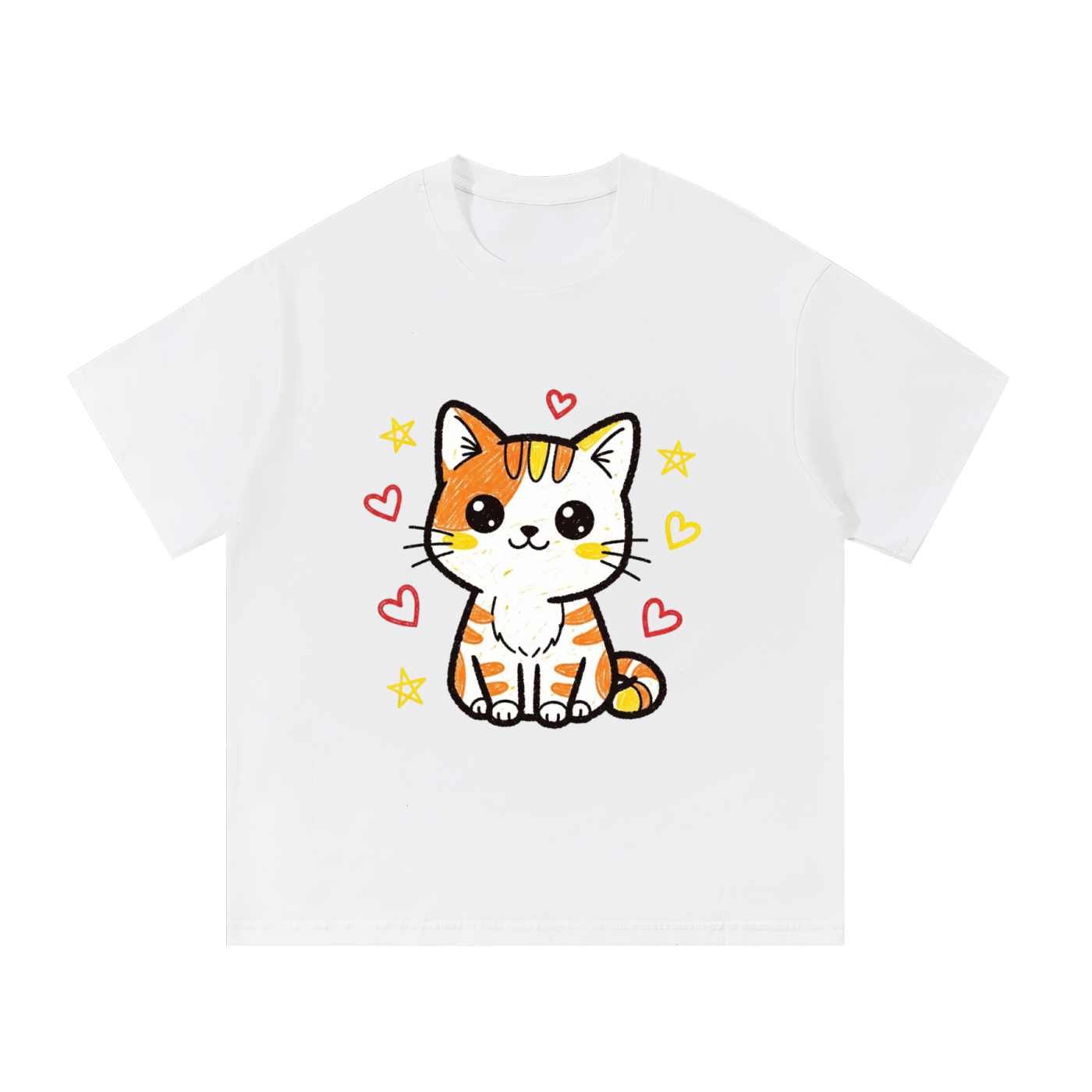 This tee features a charming, hand-drawn style design of an orange and white tabby kitten with big, expressive eyes. Surrounded by floating hearts and stars, this shirt is pure joy and sweetness. It's the ultimate pick for cat lovers and anyone who wants to add a dose of adorable charm to their everyday look.
