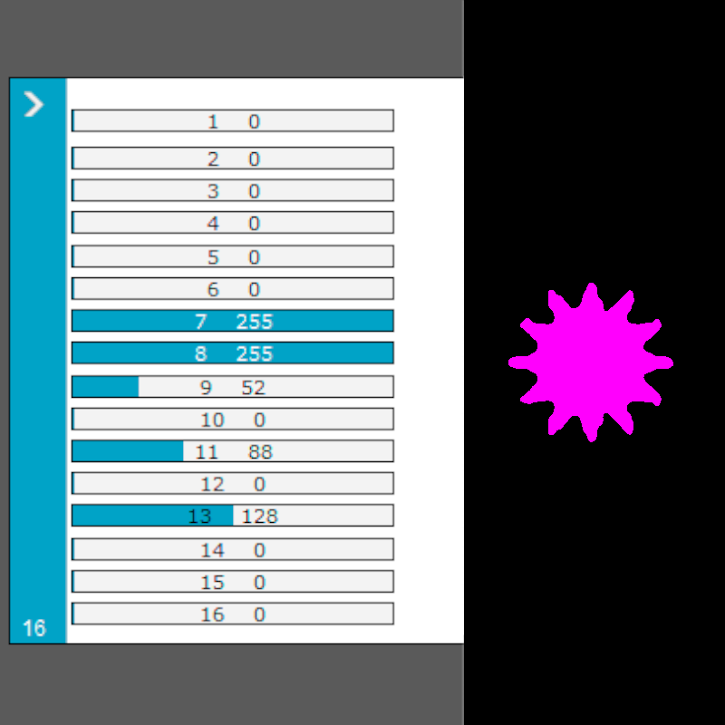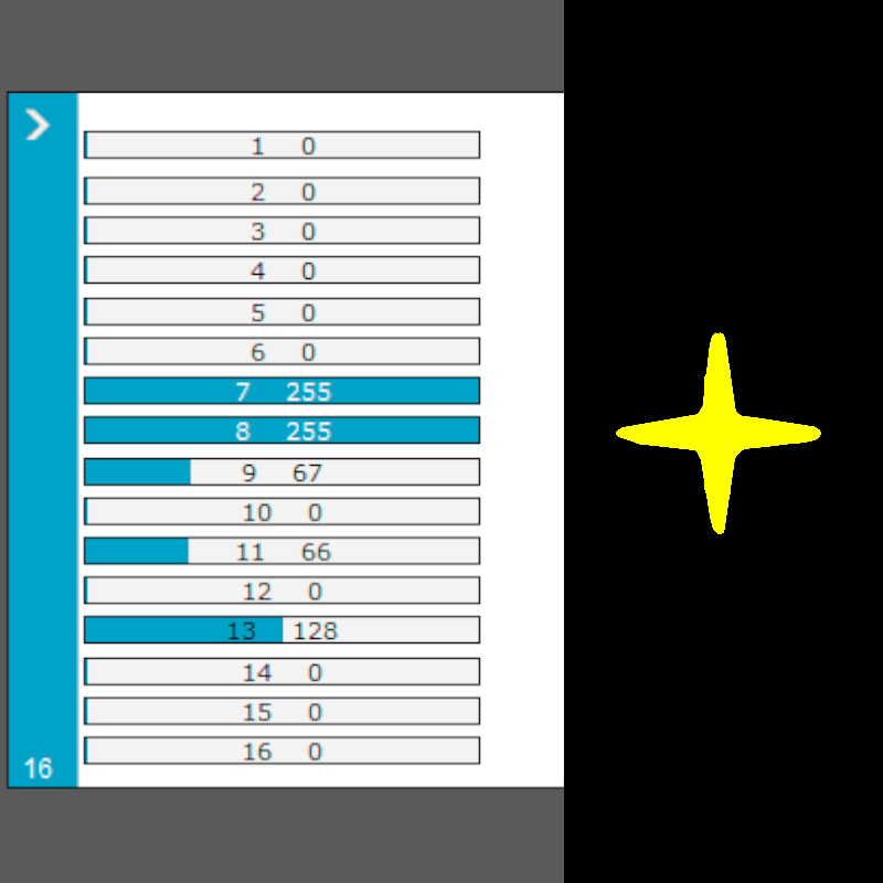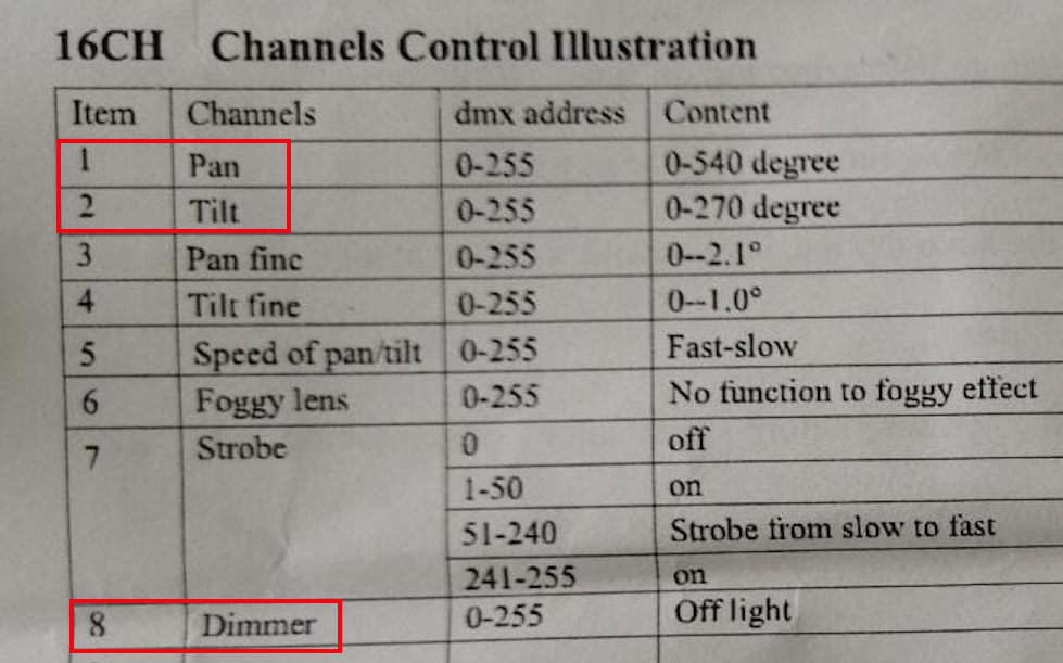 * Verifique, con un Fixture de pruebas (click), que coincidan estos canales: 8 Dimmer, 7 Strobo / Shutter, 9 en el valor 67 = Color Amarillo, 9 en el valor 52 = Color Magenta, 11 en el valor 66 = Gobo de Cruz, 11 en el valor 88 = Gobo de Sol, 13 foco (fotos 3 y 4).