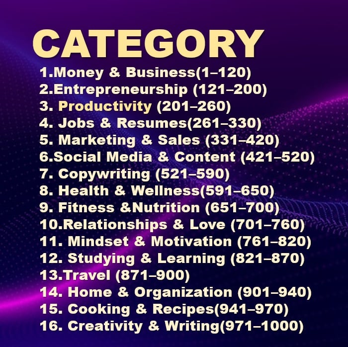 Transform your life with 1,000 ready-to-use AI & ChatGPT prompts designed for entrepreneurs, coaches, creators, and digital businesses.