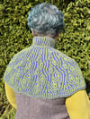 This cowl, similar to a mini poncho, features a spectacular two-colour brioche stitch leaf pattern. It’s worked top down, with a lower garter stitch border; stitches are picked up to work the brioche collar after the cowl has been blocked and it is finished with a sewn brioche cast-off.