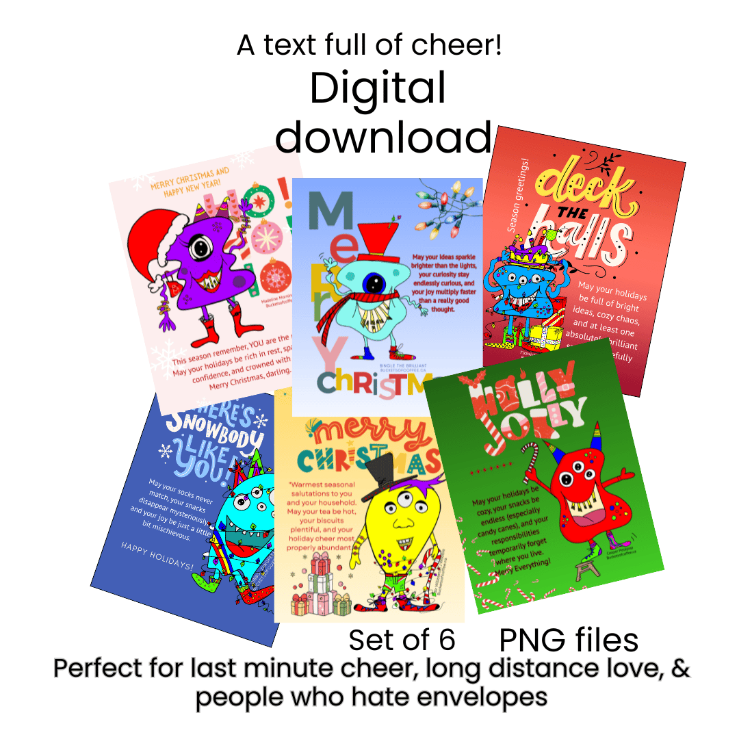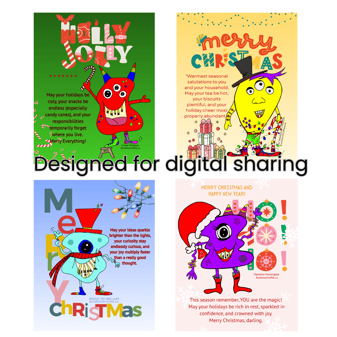 Each card features playful holiday text inspired by the Monster Emporium, cozy vibes, gentle chaos, and zero expectations included.