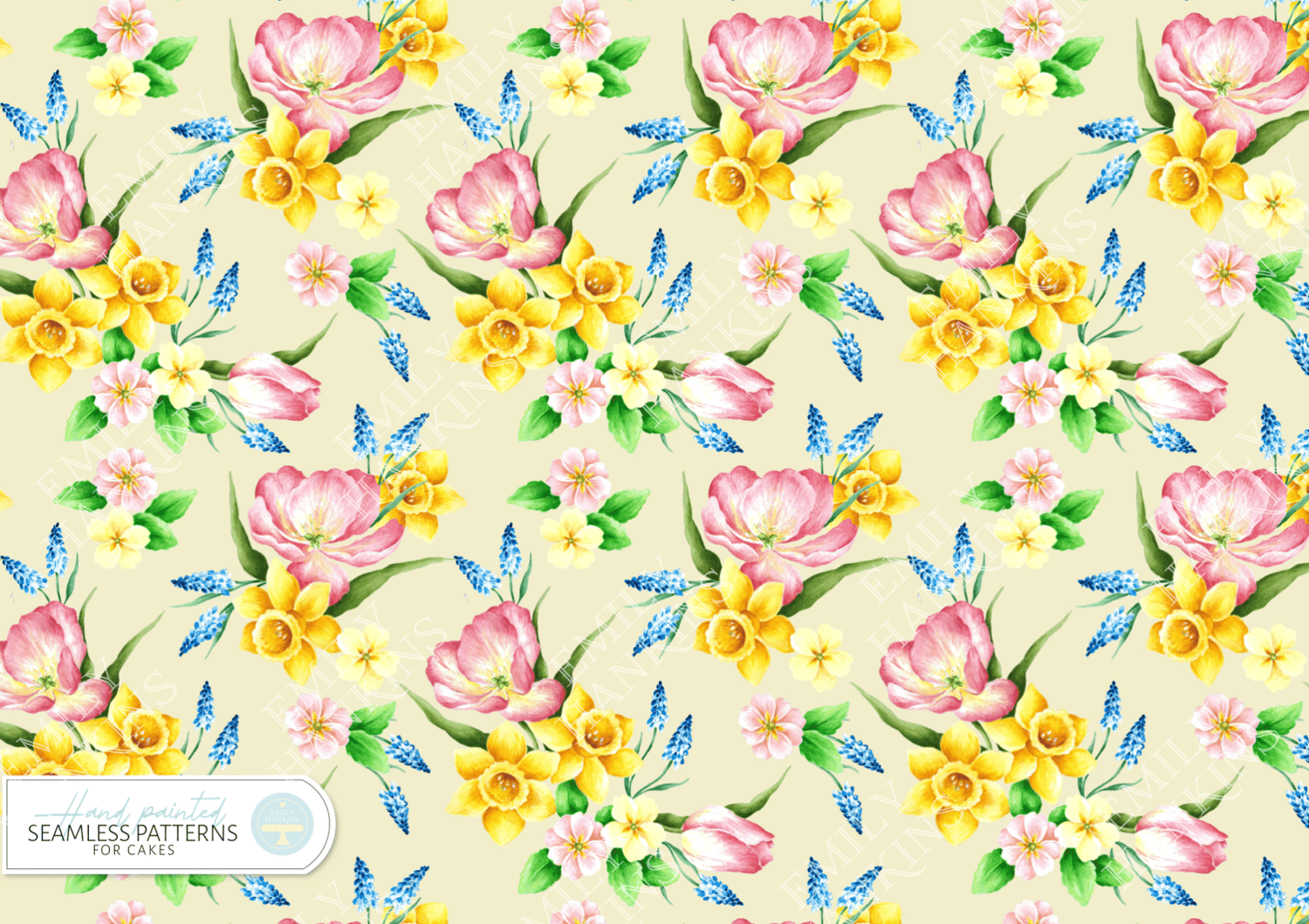 The designs are inspired by the joy of a spring garden featuring tulips, daffodils, muscari and primroses on spring green, lemon and pretty pink backgrounds. Each flower has been hand painted by Emily and painstakingly crafted into a seamless pattern for your cake designs.
