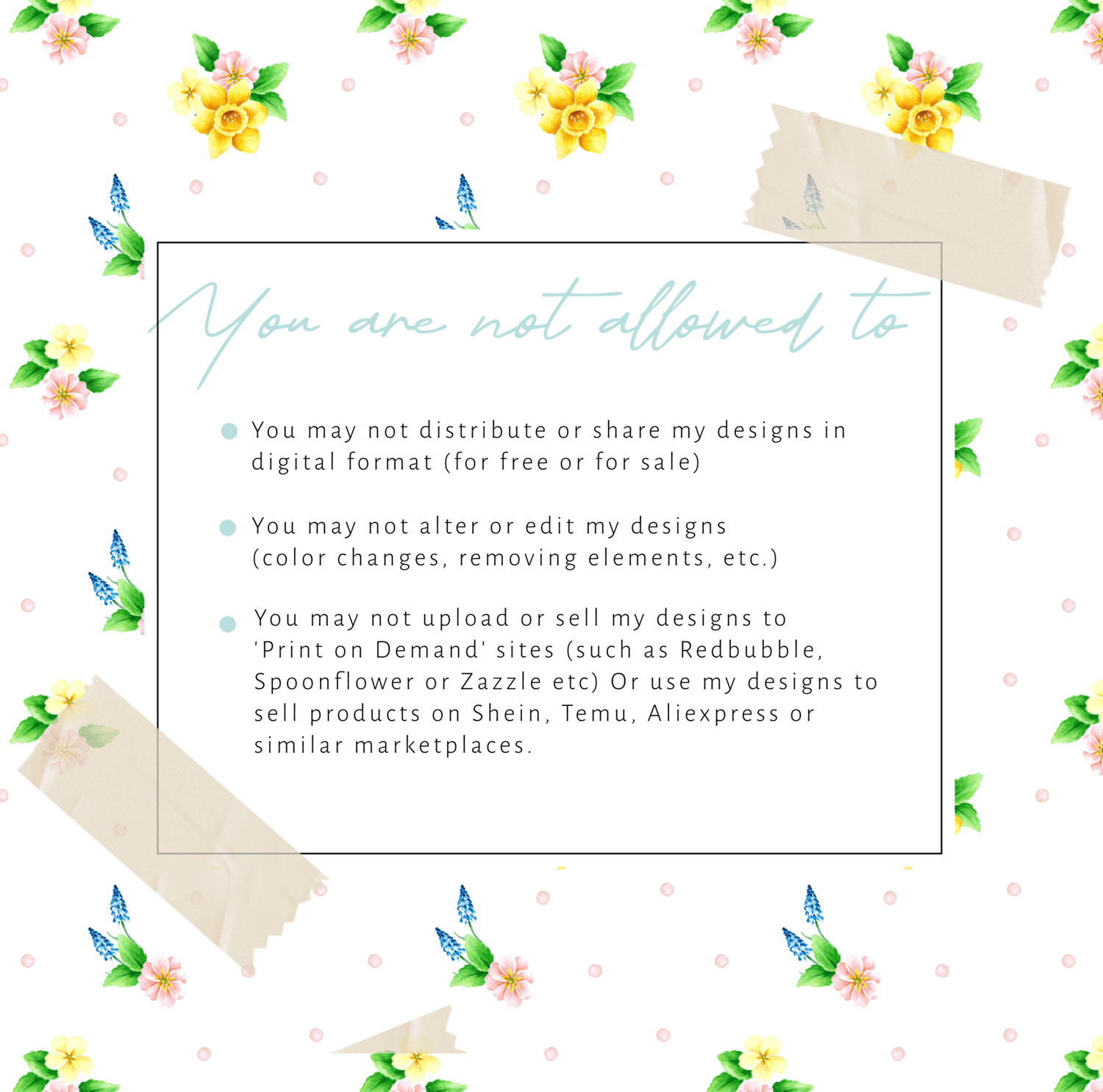 You may not upload or sell my designs to 'print on demand sites' (Such as Redbubble, Spoonflower or Zazzle etc) Or use my designs to sell products on Shien, Temu, AliExpress or other marketplaces. This does not include uploading files to external printing companies if you do not have access to an edible printer at home.