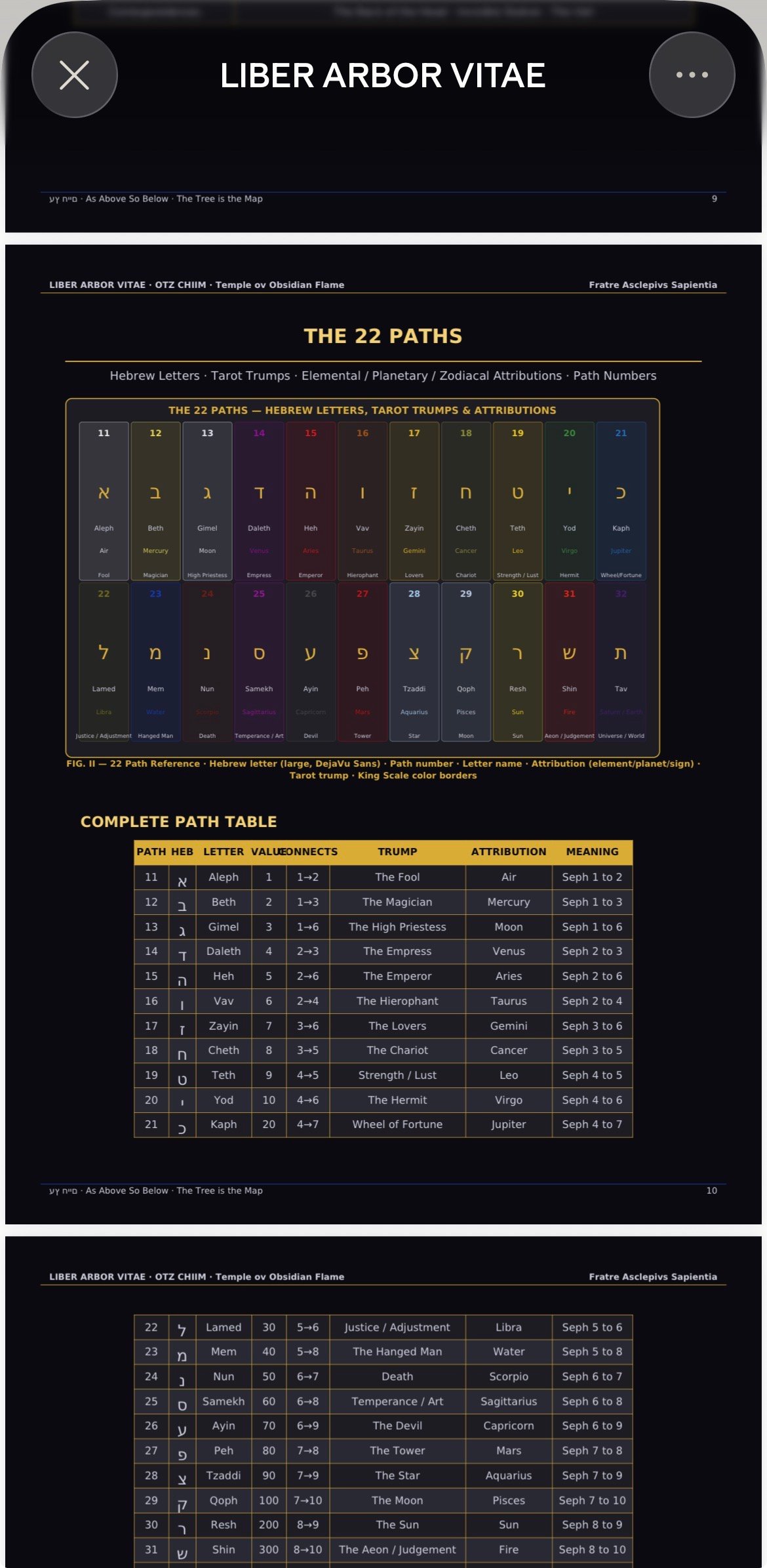 Section IV — The 22 Paths — Visual reference card (Hebrew letters large, path numbers, trump names, attributions in their path colors), complete path table, Mother Letters, Double Letters, Twelve Simple Letters — all Hebrew in DejaVu Sans